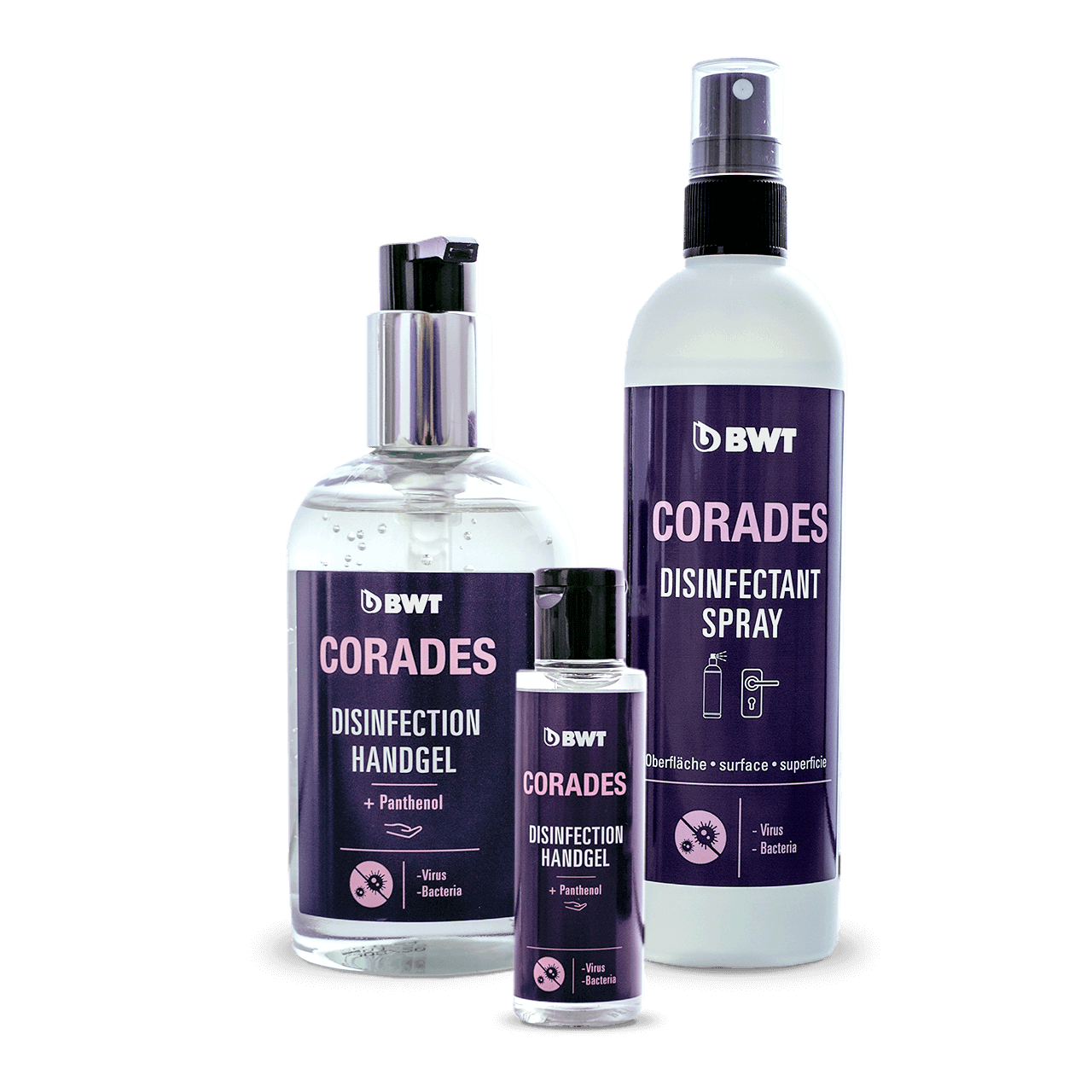 Und da kommen die Corades-Produkte von BWT ins Spiel. Sie töten 99,9 Prozent aller Bakterien und Viren ab. Ob auf Flächen oder auf den Händen: Mit dem eigens von BWT produzierten Hygieneprodukten sind Sie optimal geschützt.