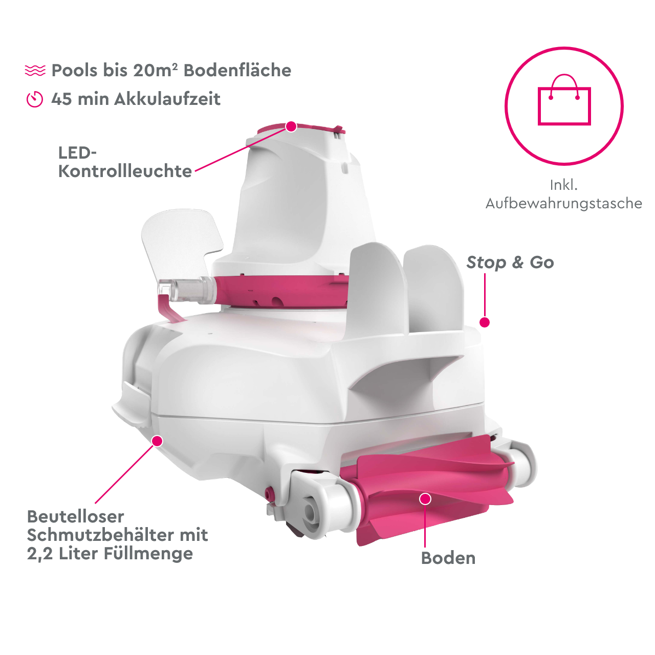 Der leistungsstarke Lithium-​Ionen-Akku garantiert Ihnen bei voller Aufladung, einen Betrieb bis zu 90 Minuten ohne Saugkraftverlust. Mit der großen Schmutzauffangkammer des BWT Akku-Poolroboters BC100 Plus, mit einem Fassungsvermögen von 2,2 Litern, kann der Roboter eine große Menge an Verunreinigungen aufnehmen. Durch das patentierte "Stop-​Rotate and Go"-​System fährt der kleine Poolroboter ohne Unterbrechung Ihren Poolboden ab und dreht sich automatisch bei Kontakt mit der Poolwand. Das kompakte und leichte Design ermöglicht einen mühelosen Transport in und aus dem Pool.