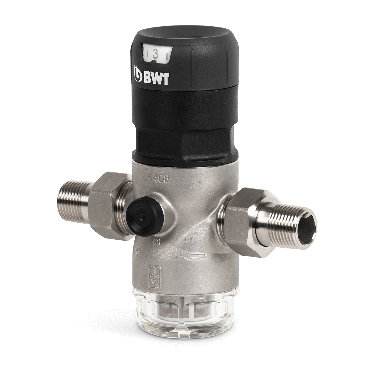 Der BWT D1 Druckminderer schützt Wasserversorgungs-anlagen im Ein- und Mehrfamilienhaus, gewerblichen und industriellen Gebäuden vor zu hohem Versorgungsdruck entsprechend ÖNORM EN 806-2 in Verbindung mit DIN 1988-200. Er hilft damit, Druckschäden zu vermeiden, Wasserverbräuche zu senken und Schallschutz zu gewährleisten. Der D1 dient zur Druckreduzierung und Einregulierung eines gewünschten Hinterdrucks und hält diesen konstant, auch wenn der Vordruck stark schwankt. Ein gleichmässiger und nicht zu hoher Druck schont Armaturen und Geräte in der gesamten Wasserversorgungsanlage.