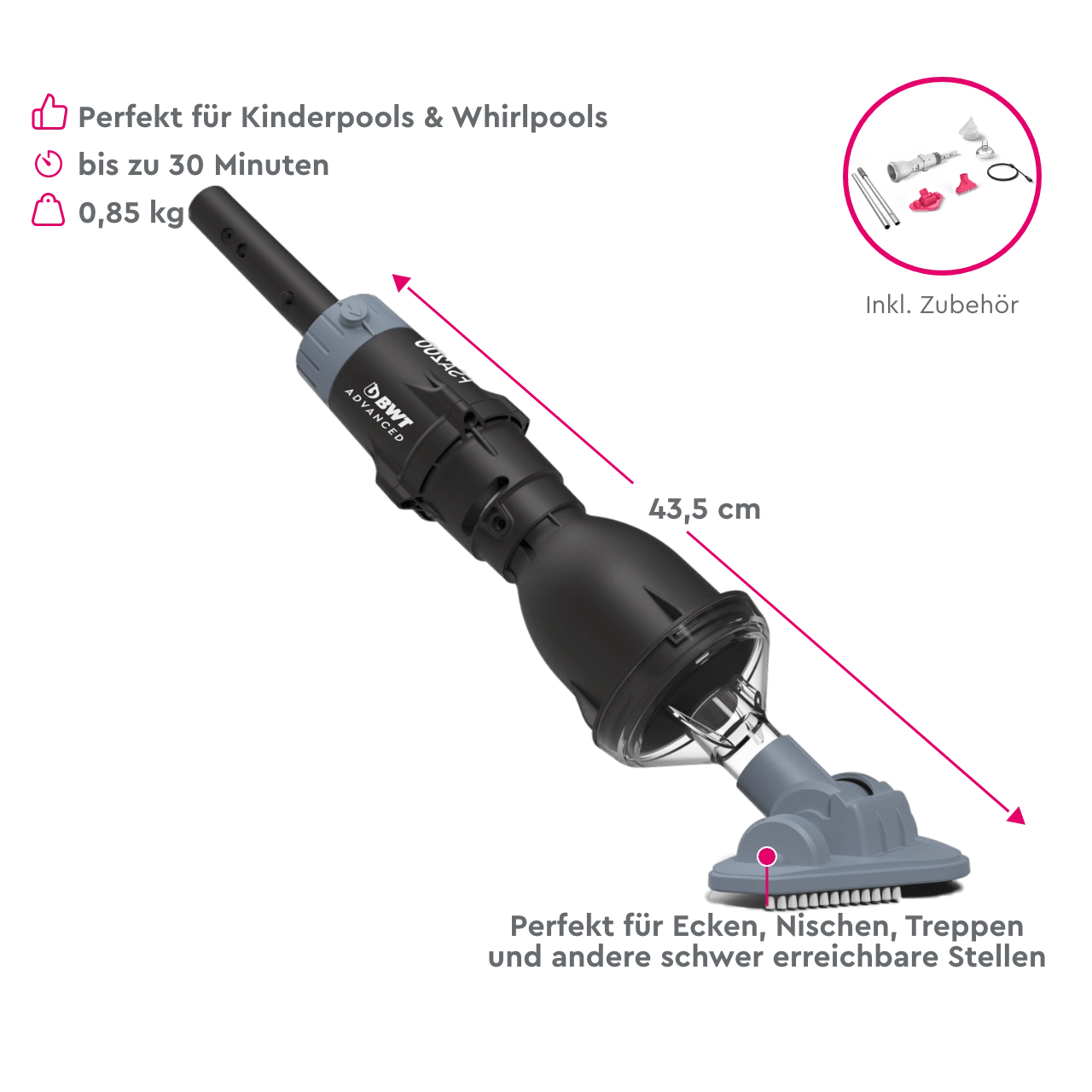 - LIEFERUMFANG: Poolsauger, Teleskopstange, Ladegerät, Stange und Flachbürsten-Aufsatz mit 2 Jahren Garantie, BWT Baumwollhandtuch