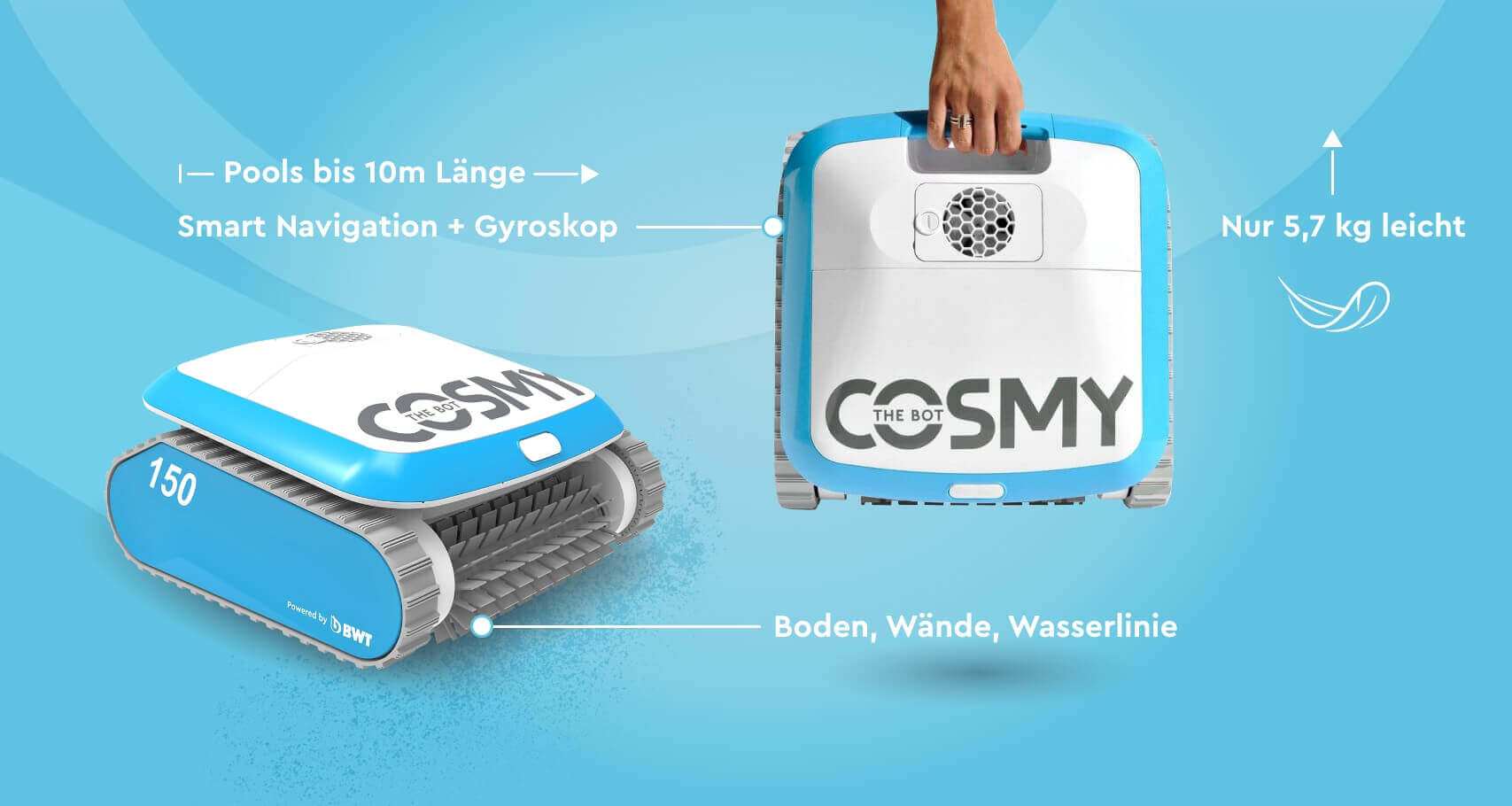 Mit den smarten Poolhelfern von BWT sparen Sie Zeit und lästiges Putzen. Lehnen Sie sich zurück und lassen Sie unseren Robotern das Reinigen erledigen. Für die schnelle Hilfe bei Verunreinigungen ist der Poolsauger bestens geeignet.