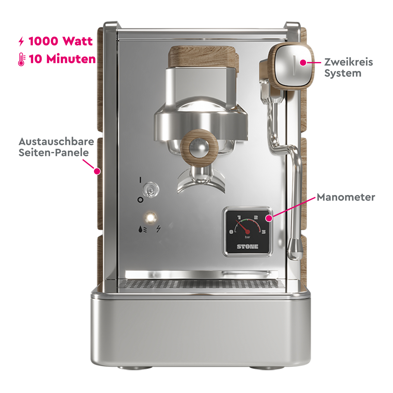 Die Stone Mine Espressomaschine besticht durch ihr kompaktes design kombiniert hochqualitativer Verarbeitung. Die Maschine besteht zur Gänze aus Metall, was für die optimale Temperaturstabilität und ein perfektes Ergebnis in der Tasse sorgt.