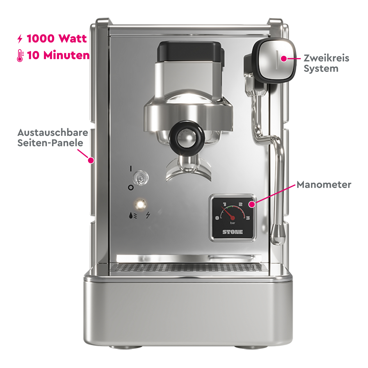 Mit einer schnellen Aufheizzeit von nur 10 Minuten sind Sie ohne lange Wartezeit bereit für perfekten Kaffee-Genuss. Und dank des innovativen Quick-Coupling-Systems ist es besonders einfach und schnell, die Slabs auszutauschen. Egal ob Sie umziehen oder Ihre Einrichtung ändern, die Stone Espresso Maschine kann sich ihrer Umgebung im Handumdrehen anpassen. In Kombination mit bestem BWT Magnesium Mineralized Wasser steht dem perfekten Kaffeegenuss zuhause nichts mehr im Weg.
