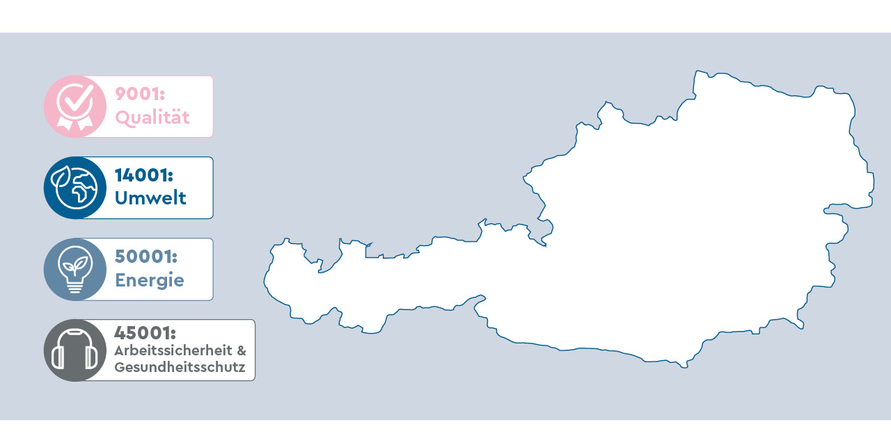 Um das Thema Nachhaltigkeit langfristig in all unseren Aktivitäten zu verankern, wurden an vielen Standorten sowohl ein Umwelt- und Energiemanagement nach ISO 14001 bzw. ISO 50001 als auch die ISO 45001 zur Sicherstellung von Arbeits- und Gesundheitsschutz eingeführt. So setzen wir ein klares Zeichen: Für unsere Umwelt, für unsere Mitarbeiterinnen und Mitarbeiter und für die Effizienzansprüche unserer Kunden.