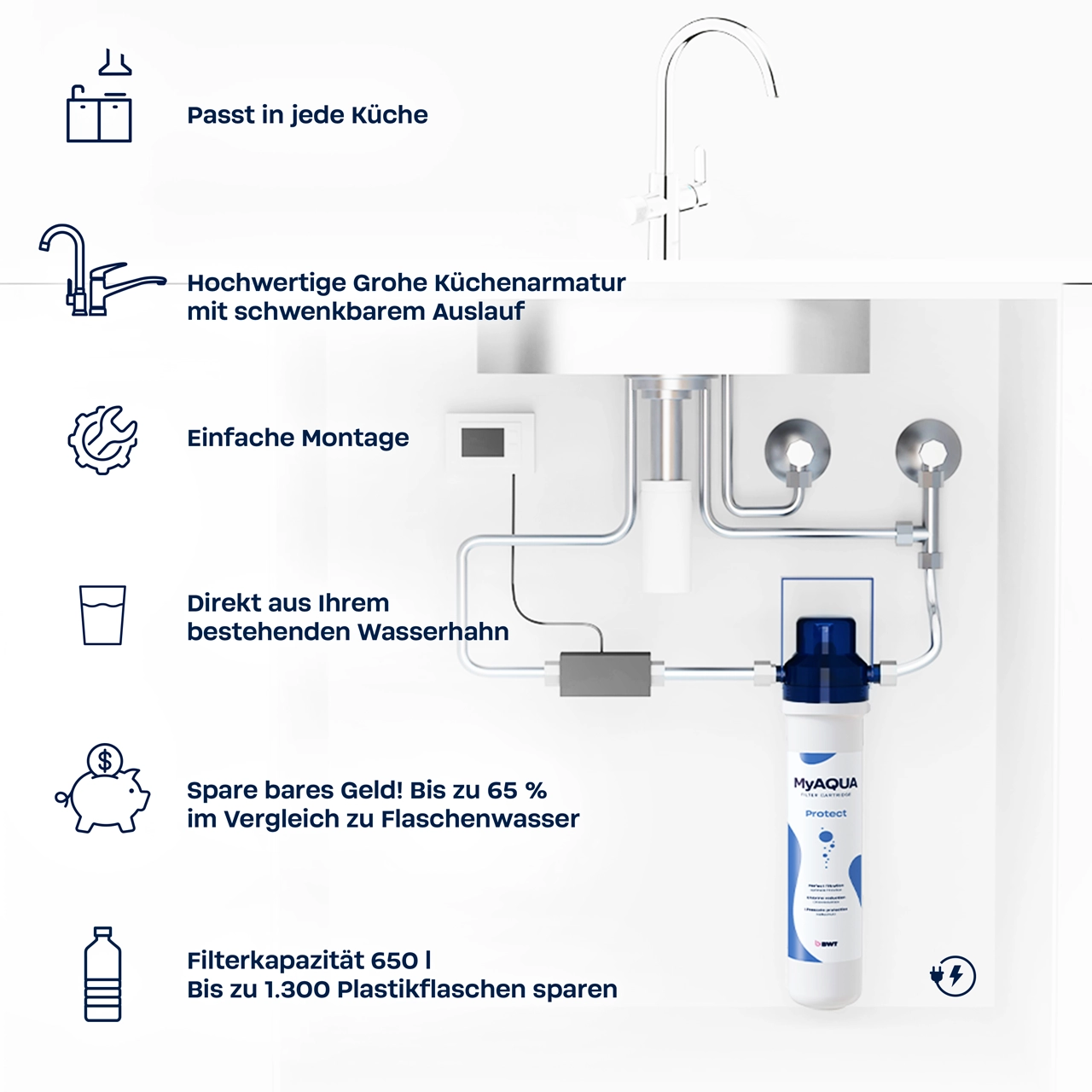 Das gesamte AQA drink Filterprogramm kann mit der neuen BWT Filterarmatur powered by Grohe verwendet werden. Verbessere dein Trinkwasser durch Anreicherung mit Magnesium und Zink! In fünf Filtrationsstufen werden unangenehme Gerüche und Geschmacksstoffe wie Chlor sowie Schwermetalle wie Kupfer, Blei und Nickel reduziert. Darüber hinaus entfernt der Filter Kalkablagerungen zuverlässig und schützt so deine Haushaltsgeräte.