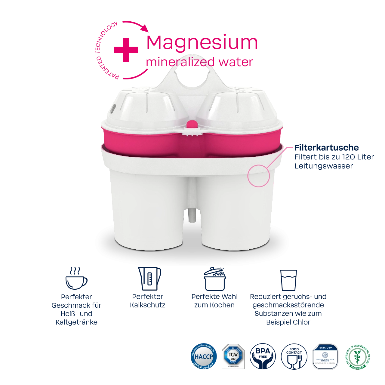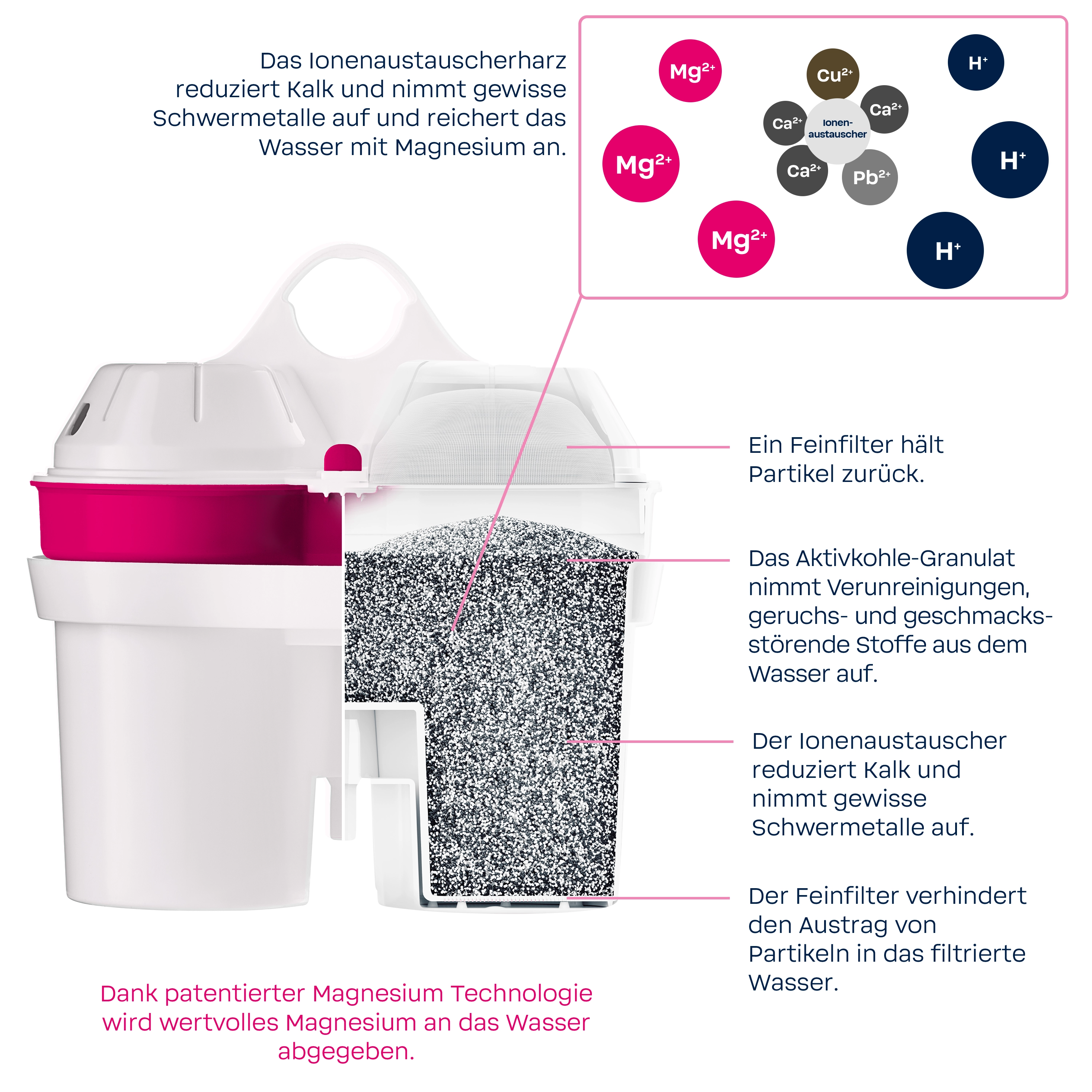 - Magnesium Mineralized Water: Kalk- und Schwermetallgehalt werden reduziert, Kalzium-Ionen werden durch Magnesium-Ionen ausgetauscht.