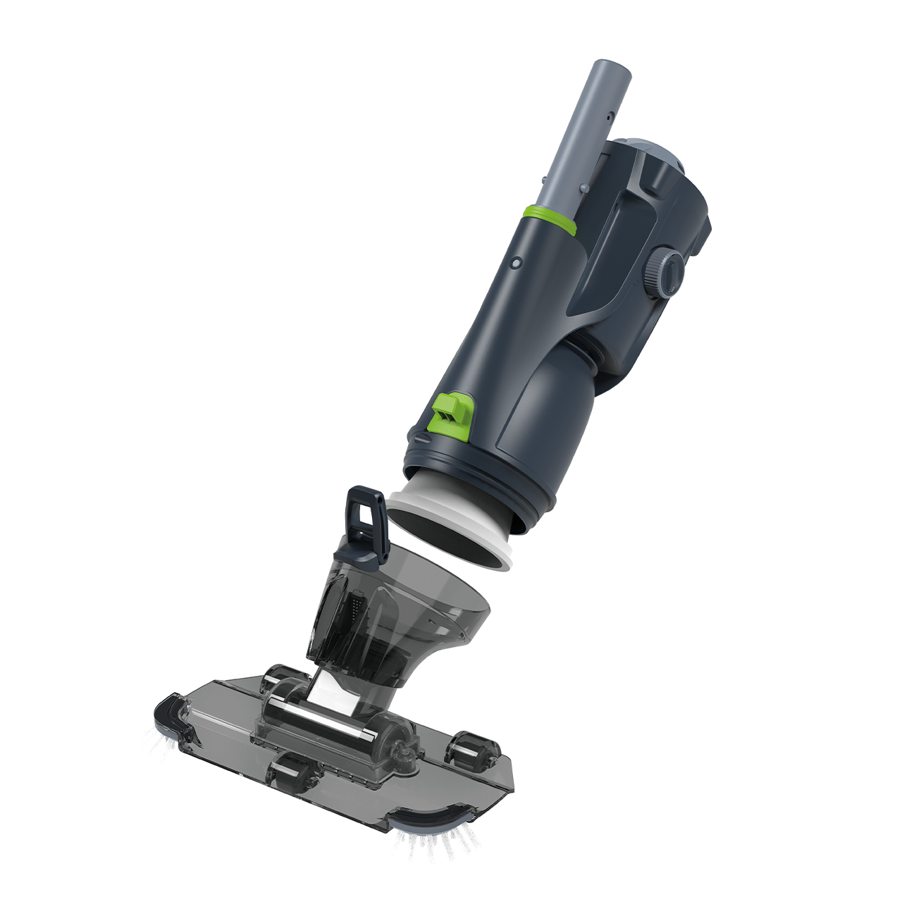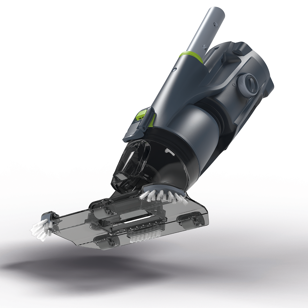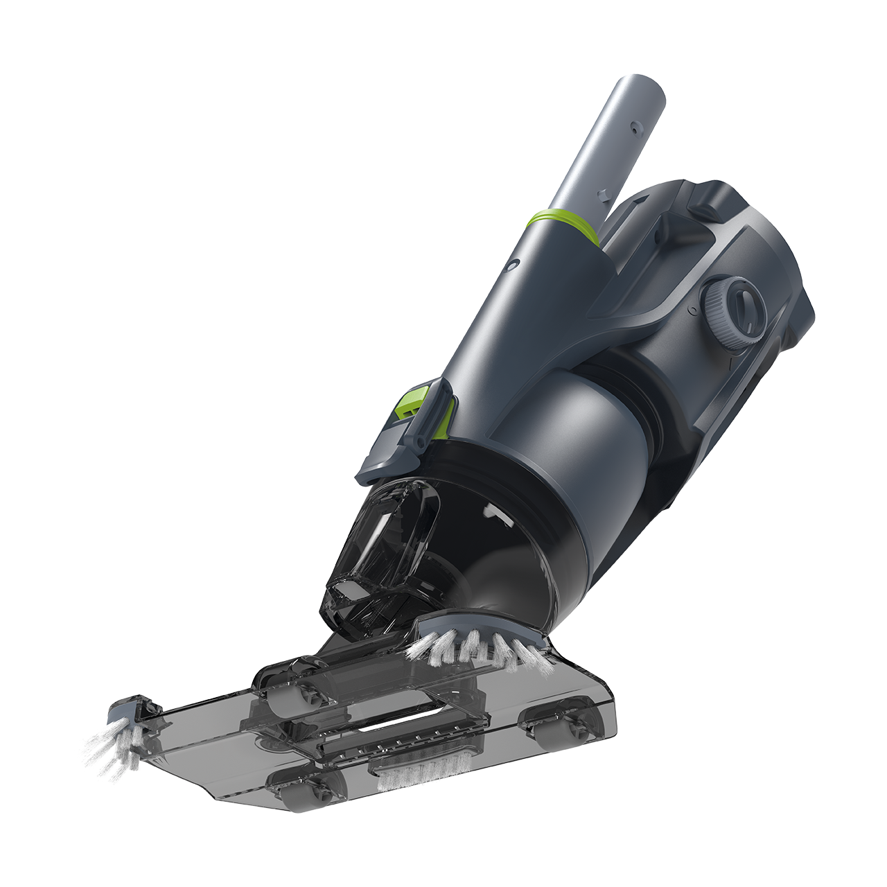Transparent suction head design for improved cleaning efficiency and visibility of debris collection.