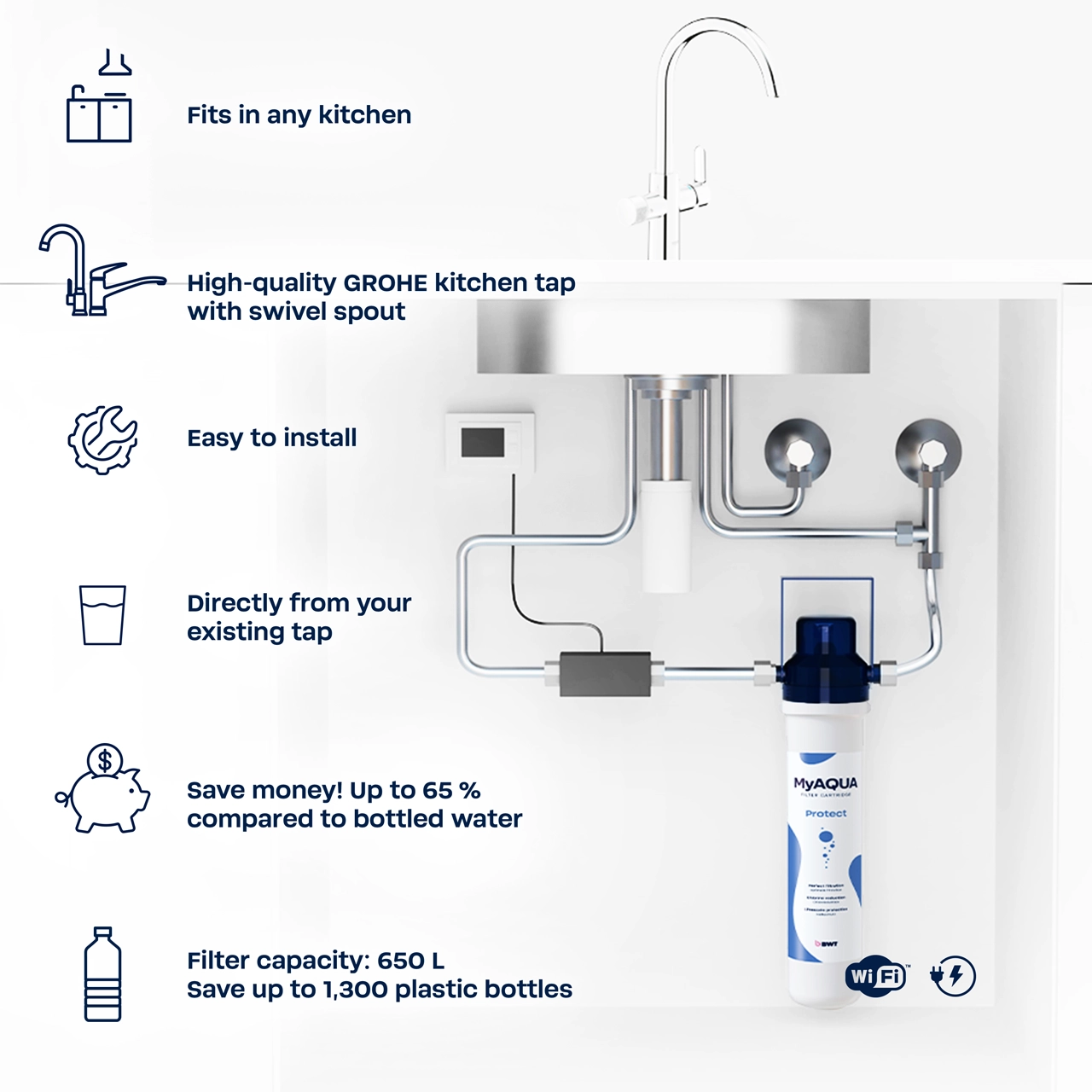 - "Protect" filter cartridge reduces lime content, protects your appliances from deposits, thereby extending their lifespan