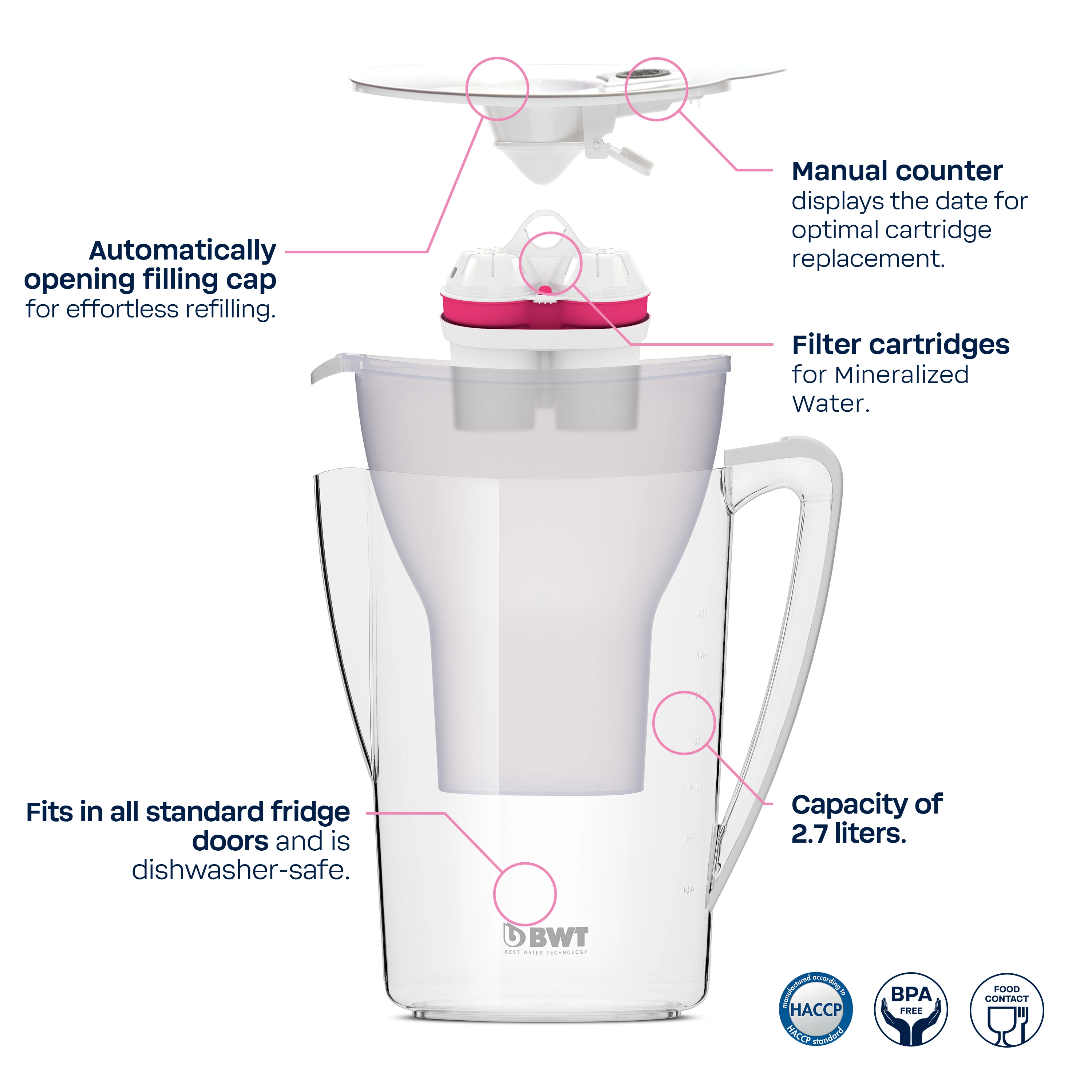 The high-quality material is BPA-free, ensuring safety and reliability. The integrated counter reliably reminds you when to change the cartridge, so you can always enjoy the best water quality.