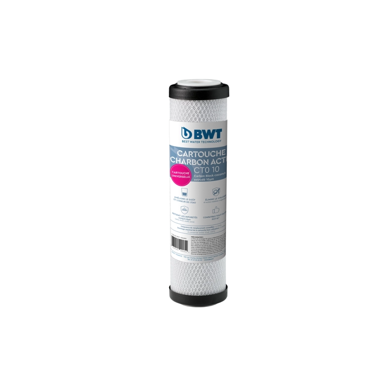 The extruded activated carbon cartridge from BWT can be installed in various types of 10" filters that include a "taste and odor removal" stage. It is particularly compatible with the Diflo filter and the Pureactif filter from BWT's product range.