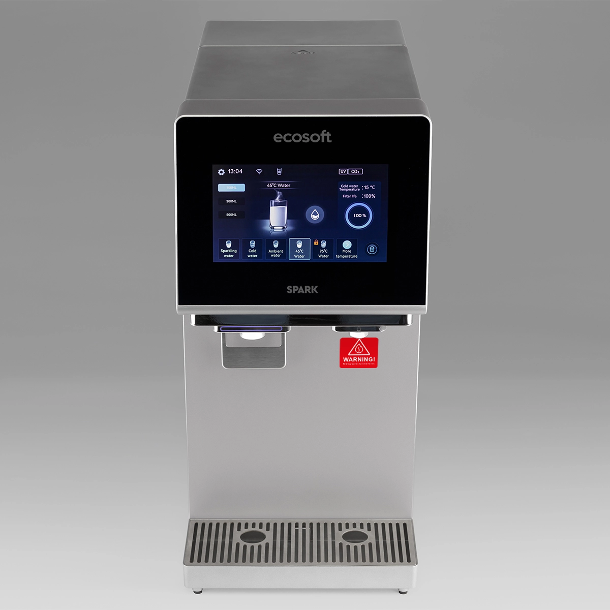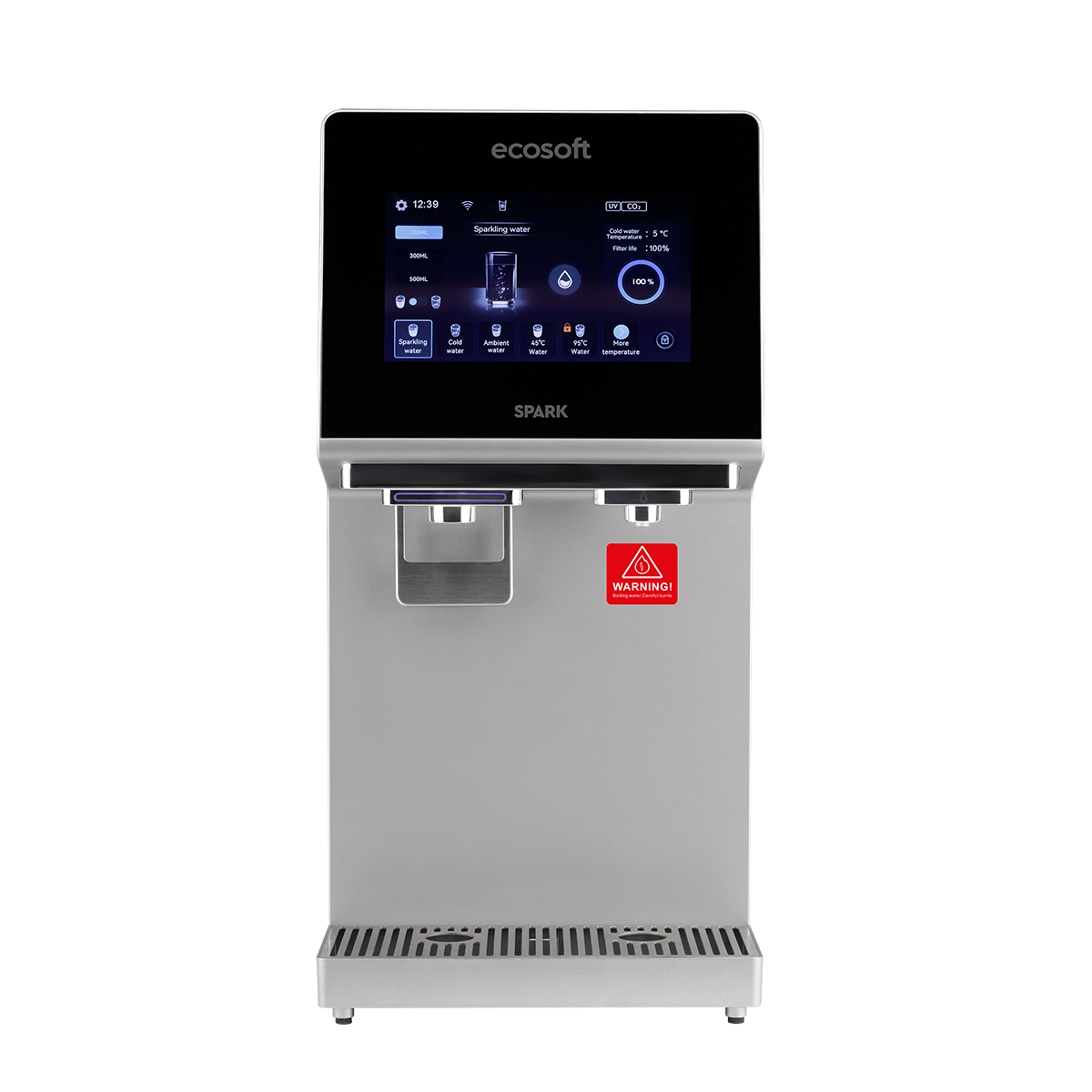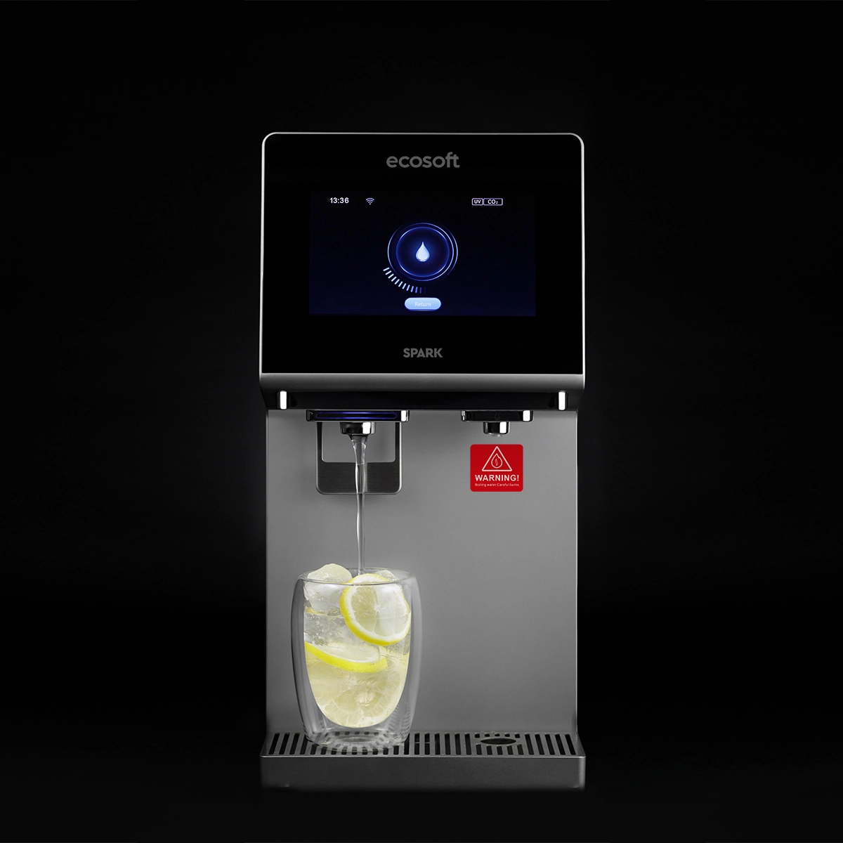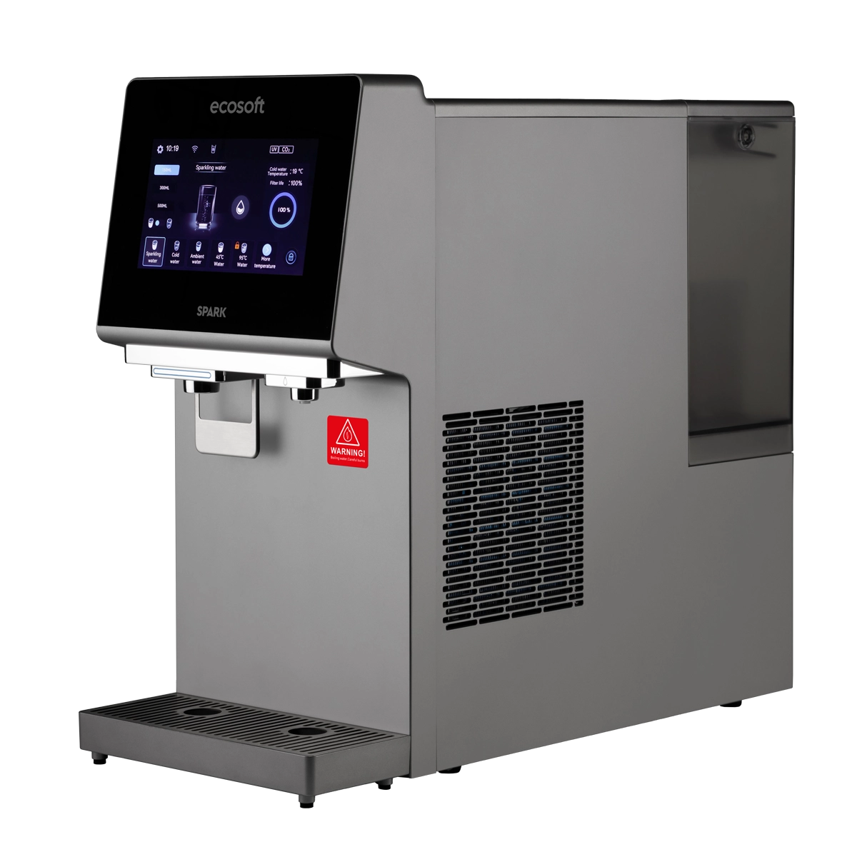 Ecosoft SPARK smart countertop reverse osmosis dispenser is a compact all-in-one system that provides cold, warm, hot, boiling, and chilled sparkling water. Its 4-stage RO filtration removes up to 99% of impurities, while the touchscreen offers easy control of temperature, volume, and system status with real-time TDS monitoring. The dispenser works from a built-in 5 L tank or direct tap connection, and features UV sterilization, a child safety lock, and Wi-Fi connectivity via the Smart Life app. With its sleek, space-saving design, SPARK is a practical and stylish solution for homes, offices, and kitchens where clean, great-tasting water in multiple formats is essential.