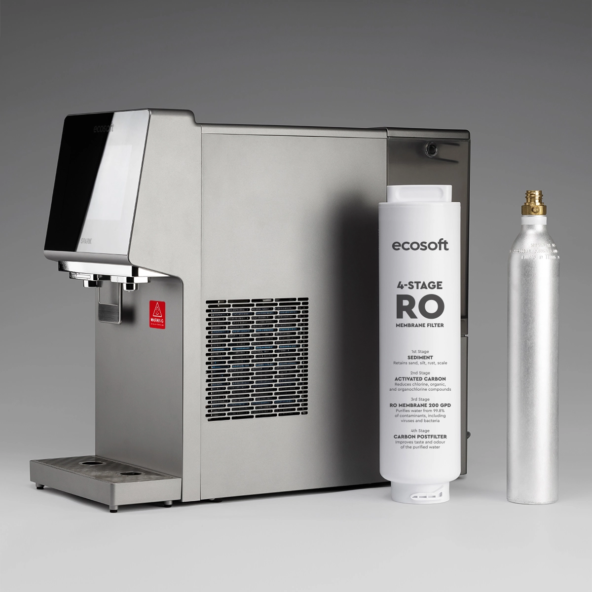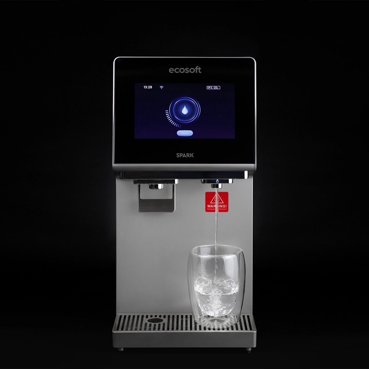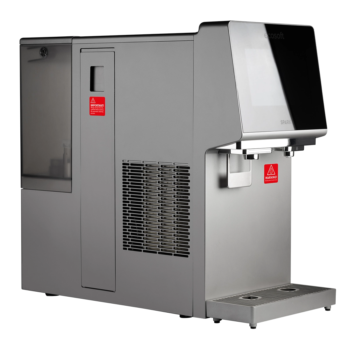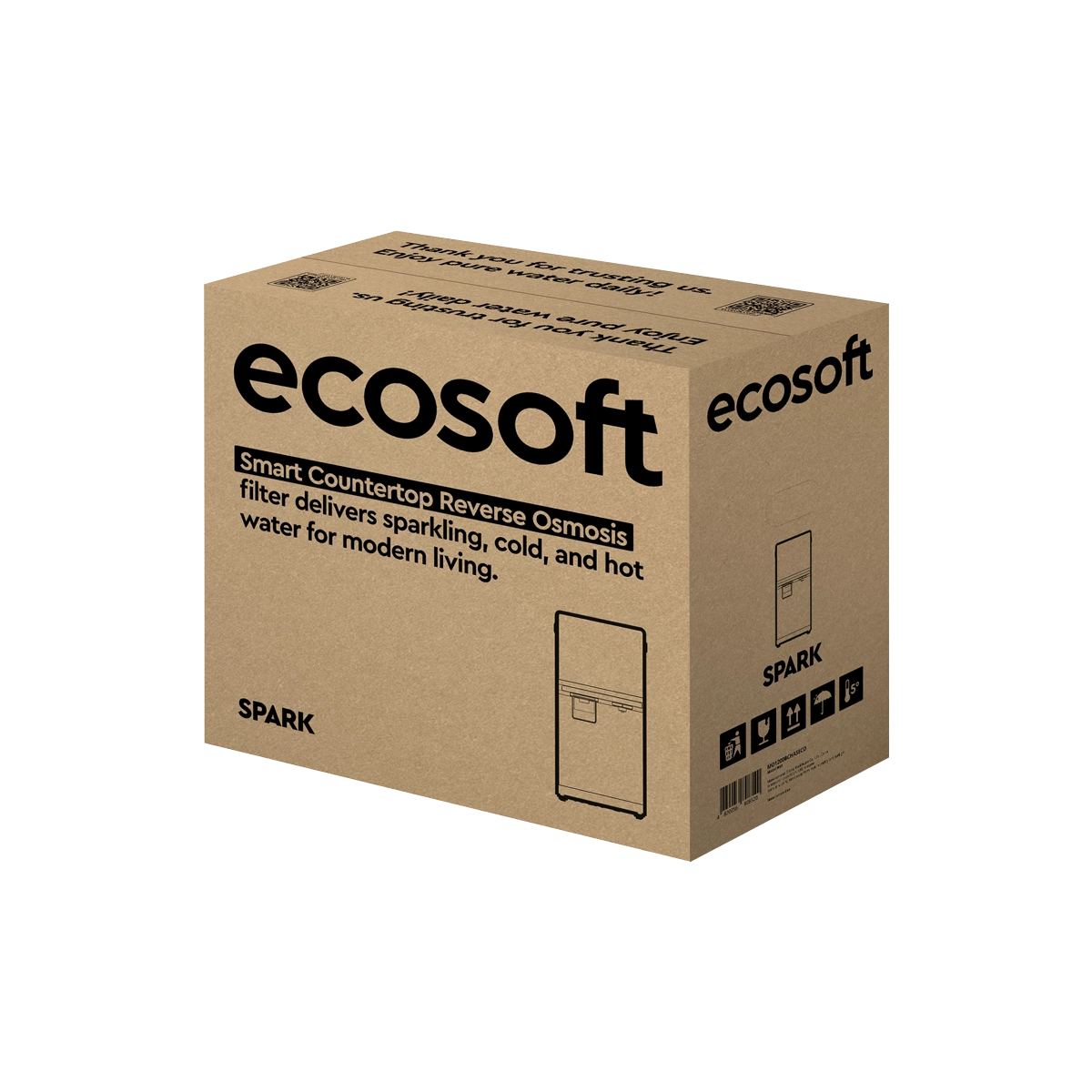 Ecosoft SPARK smart countertop reverse osmosis dispenser is a compact all-in-one system that provides cold, warm, hot, boiling, and chilled sparkling water. Its 4-stage RO filtration removes up to 99% of impurities, while the touchscreen offers easy control of temperature, volume, and system status with real-time TDS monitoring. The dispenser works from a built-in 5 L tank or direct tap connection, and features UV sterilization, a child safety lock, and Wi-Fi connectivity via the Smart Life app. With its sleek, space-saving design, SPARK is a practical and stylish solution for homes, offices, and kitchens where clean, great-tasting water in multiple formats is essential.