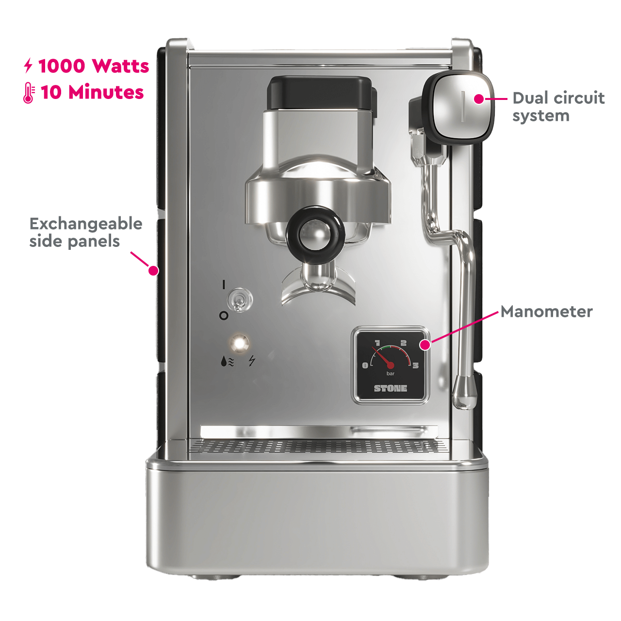 With a quick heating time of just 10 minutes, you're ready for perfect coffee enjoyment without a long wait. And thanks to the innovative Quick-Coupling system, it's especially easy and quick to exchange the side panels. Whether you're moving or changing your setup, the Stone Espresso machine can quickly adapt to its environment. Combined with the best BWT Magnesium Mineralized Water, nothing stands in the way of perfect coffee enjoyment at home.