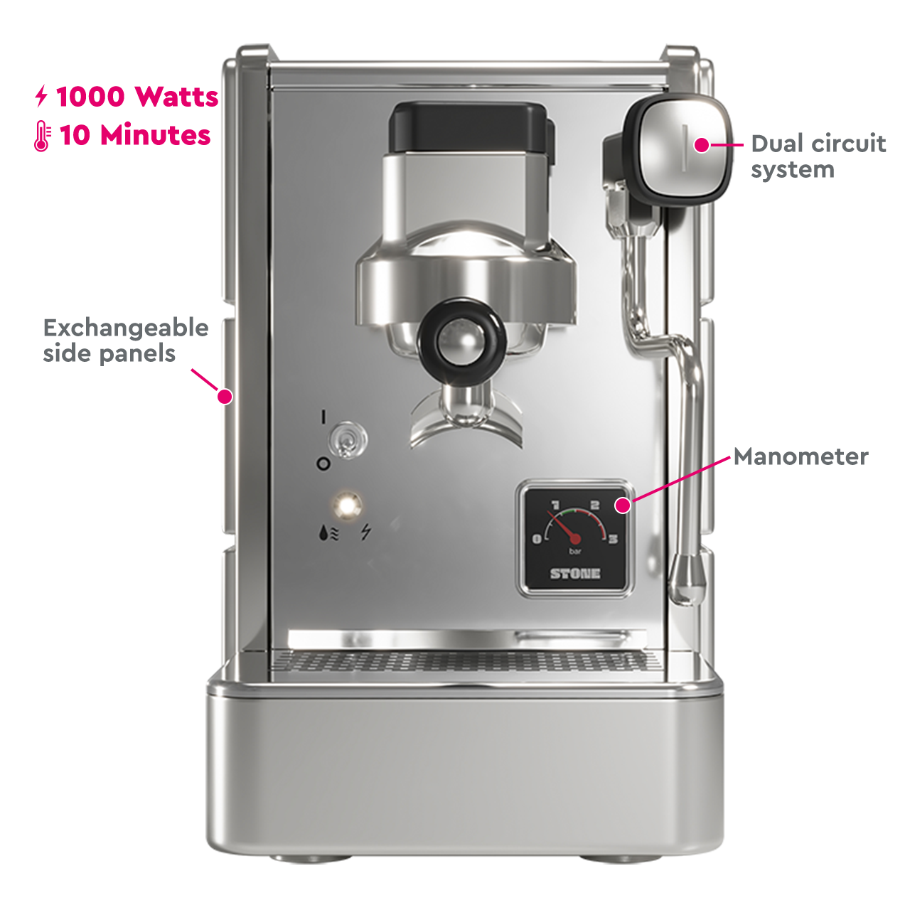 With a quick heating time of just 10 minutes, you're ready for perfect coffee enjoyment without a long wait. And thanks to the innovative Quick-Coupling system, it's especially easy and quick to exchange the side panels. Whether you're moving or changing your setup, the Stone Espresso machine can quickly adapt to its environment. Combined with the best BWT Magnesium Mineralized Water, nothing stands in the way of perfect coffee enjoyment at home.