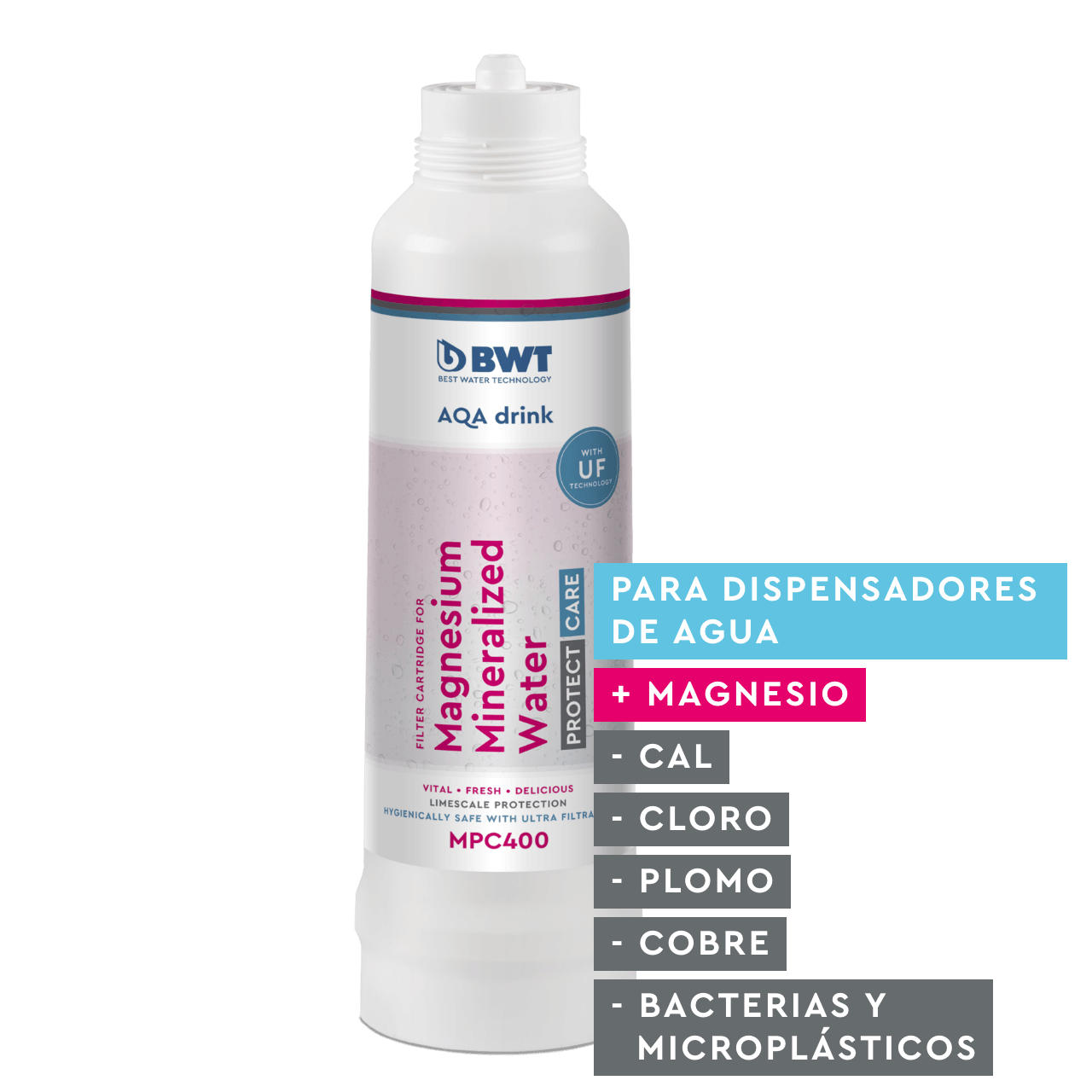 El cartucho filtrante BWT AQA drink Magnesium Mineralized Water Protect Care reduce las sustancias que alteran el olor y el sabor, como el cloro, y los metales pesados, como el cobre, el plomo y el níquel. El filtro elimina de forma fiable la cal y protege así sus aparatos. La membrana de ultrafiltración integrada retiene el 99,9999 % de todas las bacterias y reduce los microplásticos para mayor seguridad higiénica. La tecnología patentada BWT magnesio enriquece el agua filtrada con el valioso mineral magnesio. Así se consiguen los mejores resultados sensoriales para las bebidas calientes y frías. El filtro puede instalarse en combinación con un dispensador de agua potable AQA.