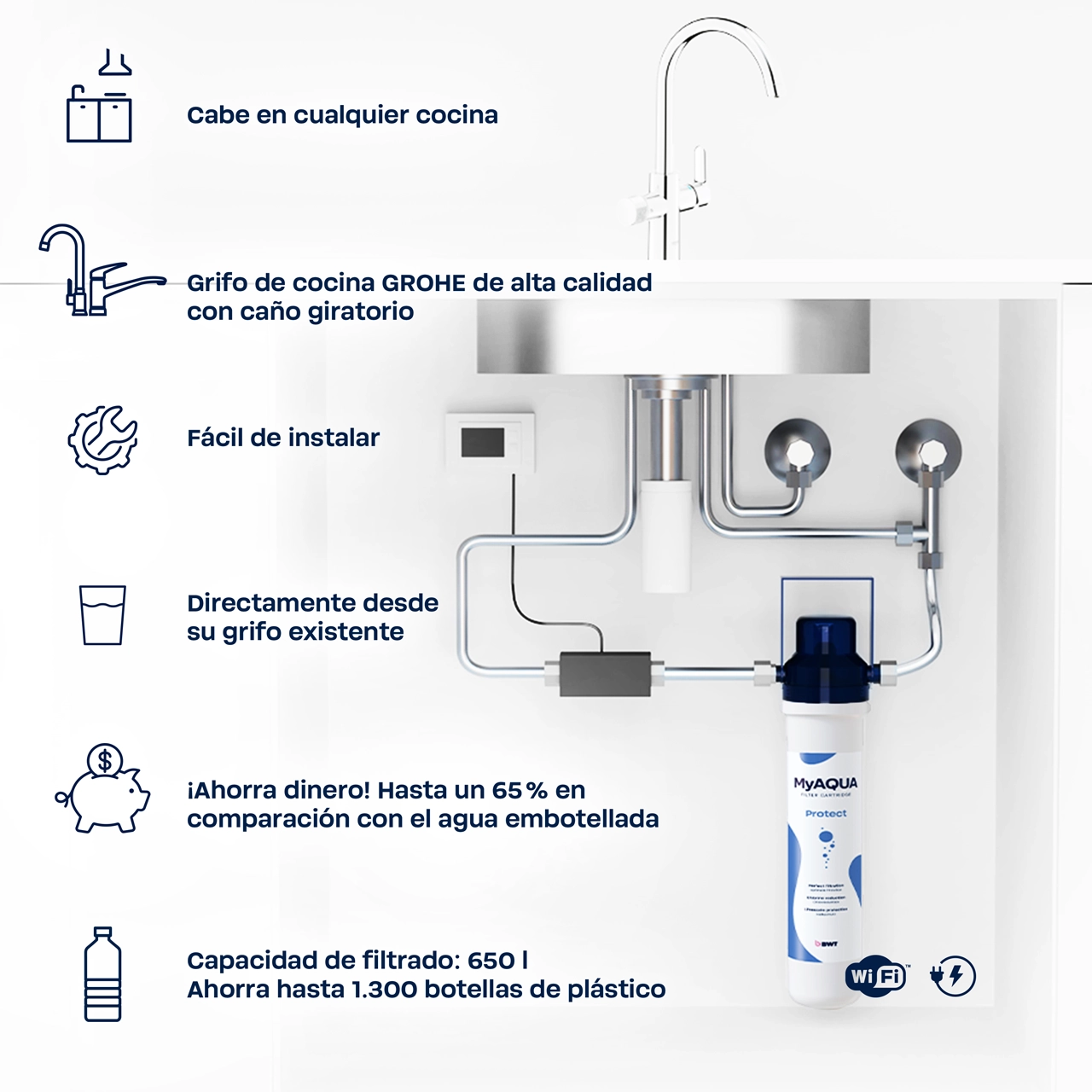 - Un grifo - dos opciones de agua: Conductos separados para agua filtrada y no filtrada