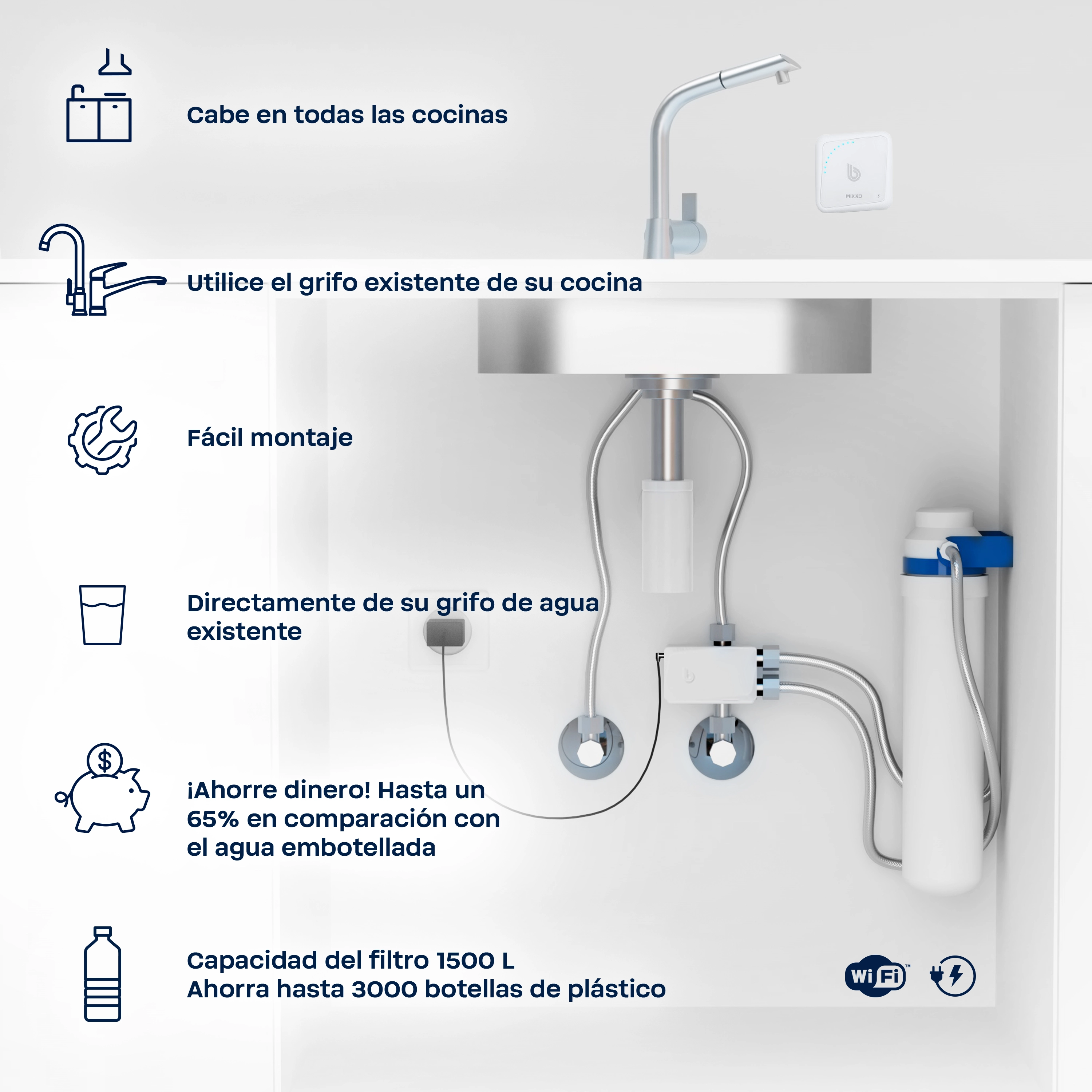 - Sensor de flujo integrado: Mide el consumo de agua y muestra el estado del filtro.