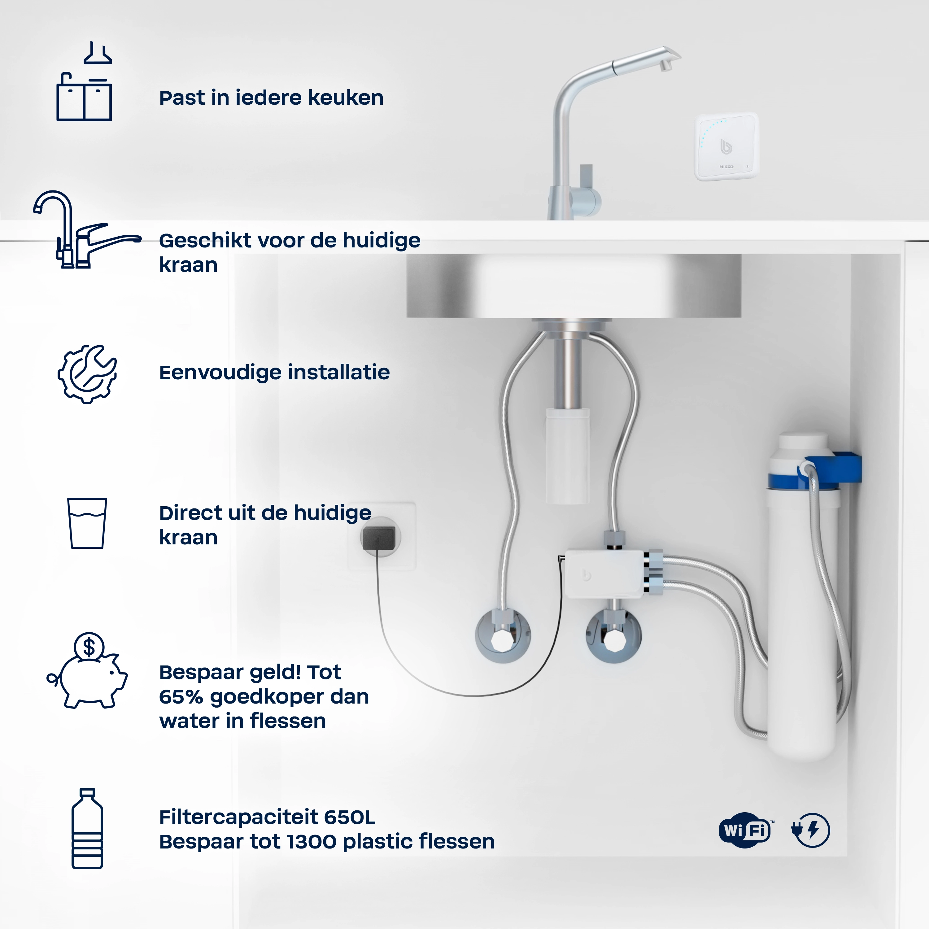 Filtro de agua bajo fregadero para tu grifo de cocina existente — incluye un cartucho MyAQUA “Perfect Taste” y una botella Climate grabada como regalo exclusivo.