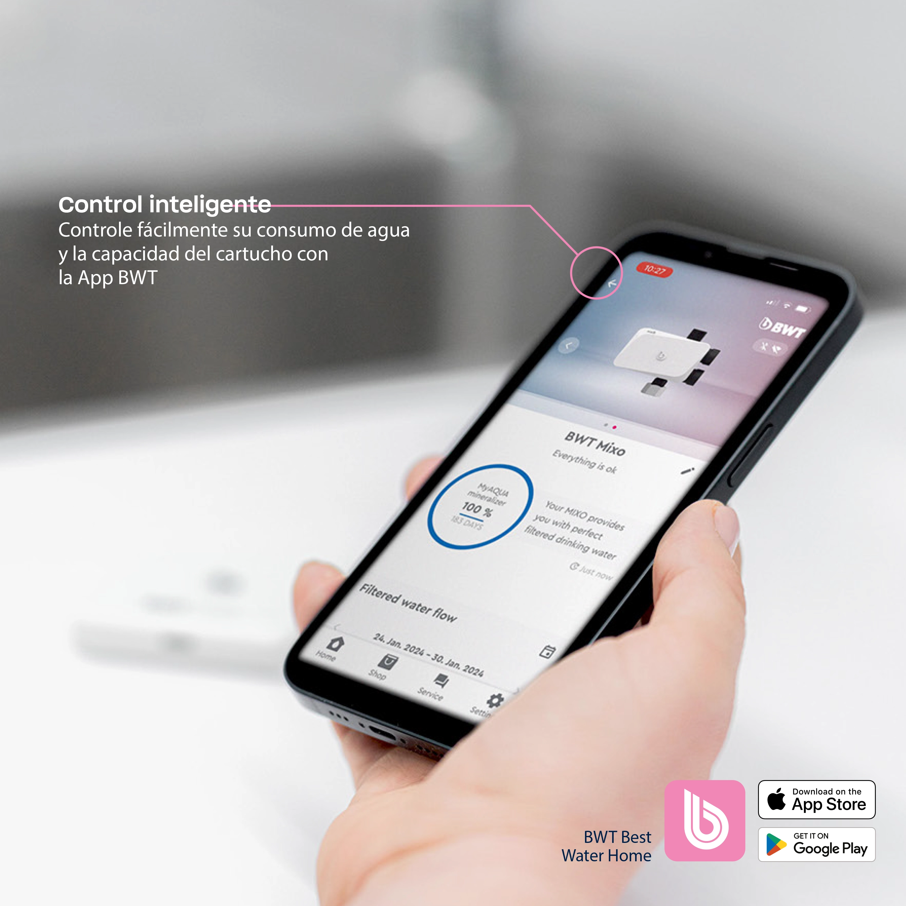 - Excelencia tecnológica: BWT MIXXO está completamente conectado, gracias a Bluetooth y WiFi. Un sensor de flujo integrado mide el consumo de agua y muestra el modo (Estándar/Filtración) y el estado del cartucho del filtro mediante señales ópticas. ¡Todo a la vista con la aplicación BWT Home!