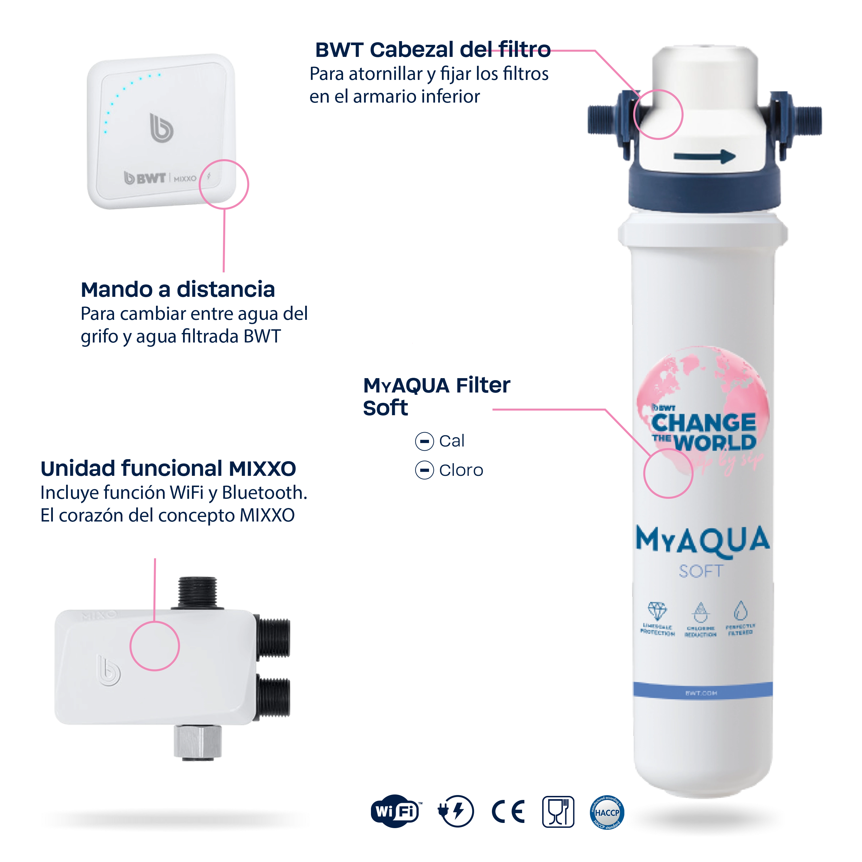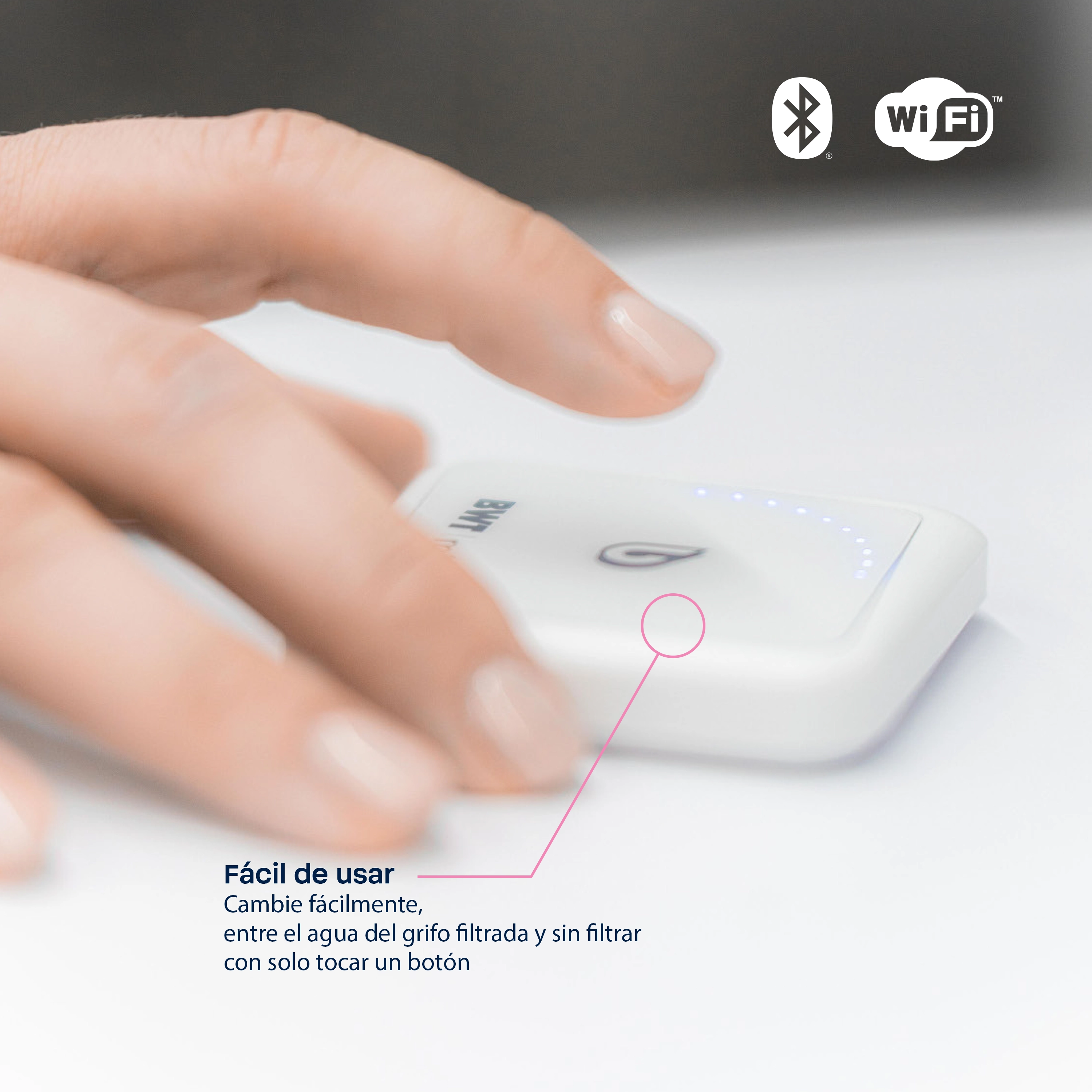 - Excelencia tecnológica: BWT MIXXO está completamente conectado, gracias a Bluetooth y WiFi. Un sensor de flujo integrado mide el consumo de agua y muestra el modo (Estándar/Filtración) y el estado del cartucho del filtro mediante señales ópticas. ¡Todo a la vista con la aplicación BWT Home!
