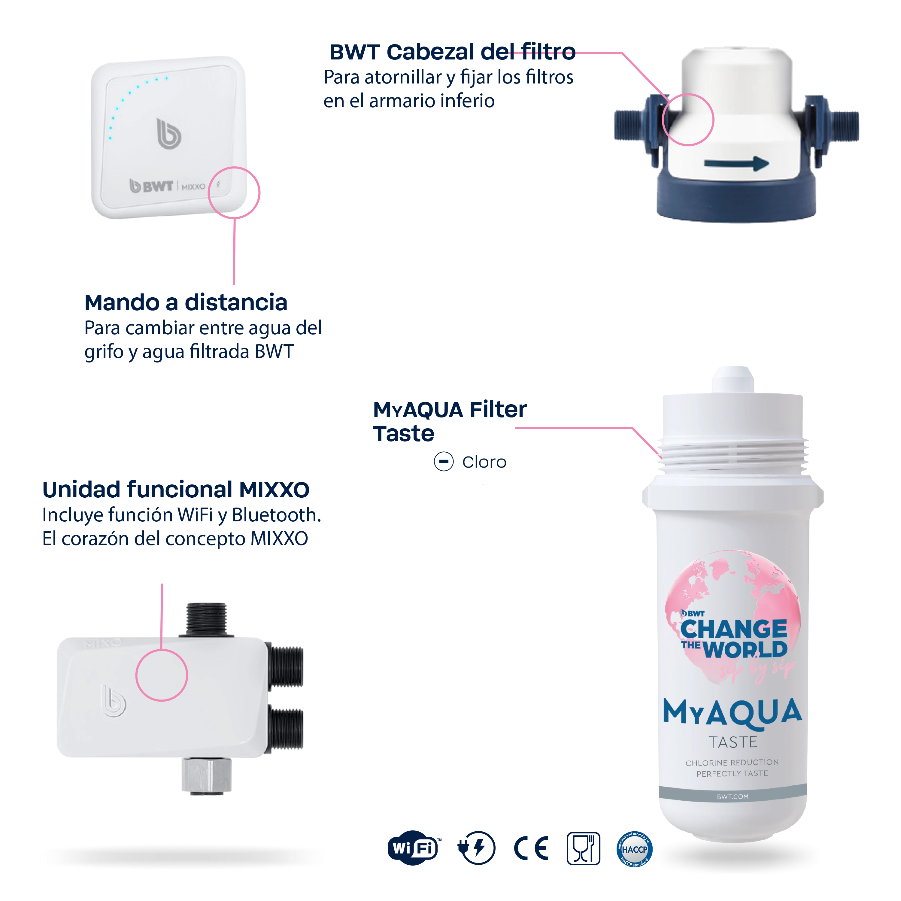 - Excelencia tecnológica: BWT MIXXO está completamente conectado, gracias a Bluetooth y WiFi. Un sensor de flujo integrado mide el consumo de agua y muestra el modo (Estándar/Filtración) y el estado del cartucho del filtro mediante señales ópticas. ¡Todo a la vista con la aplicación BWT Home!