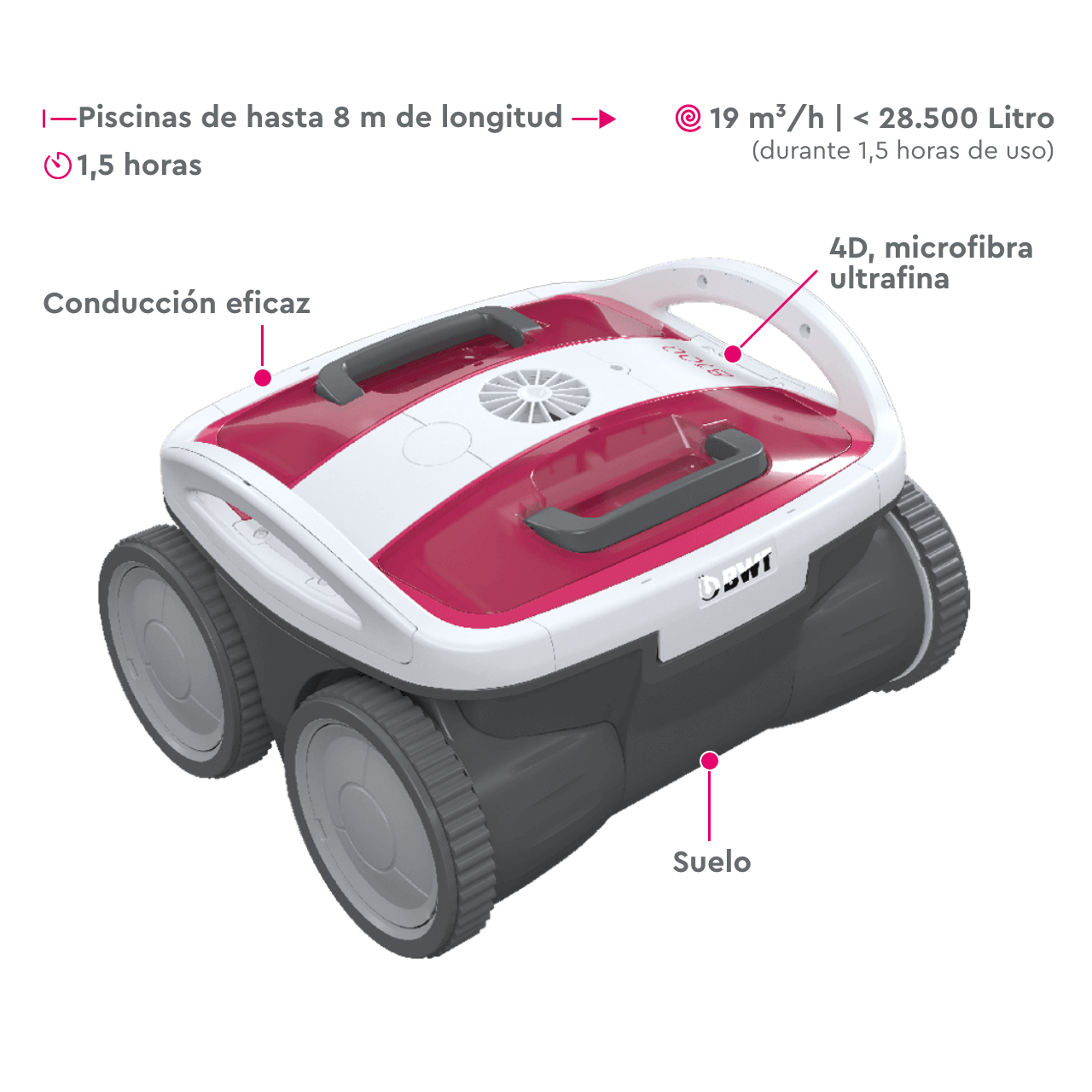 Con sus cuatro grandes ruedas, los robots de piscina BWT superan todos los obstáculos y se mueven fácilmente entre los juguetes que sus hijos olvidan en el suelo de la piscina. Conducción fácil y robusta, perfecta para una piscina familiar.