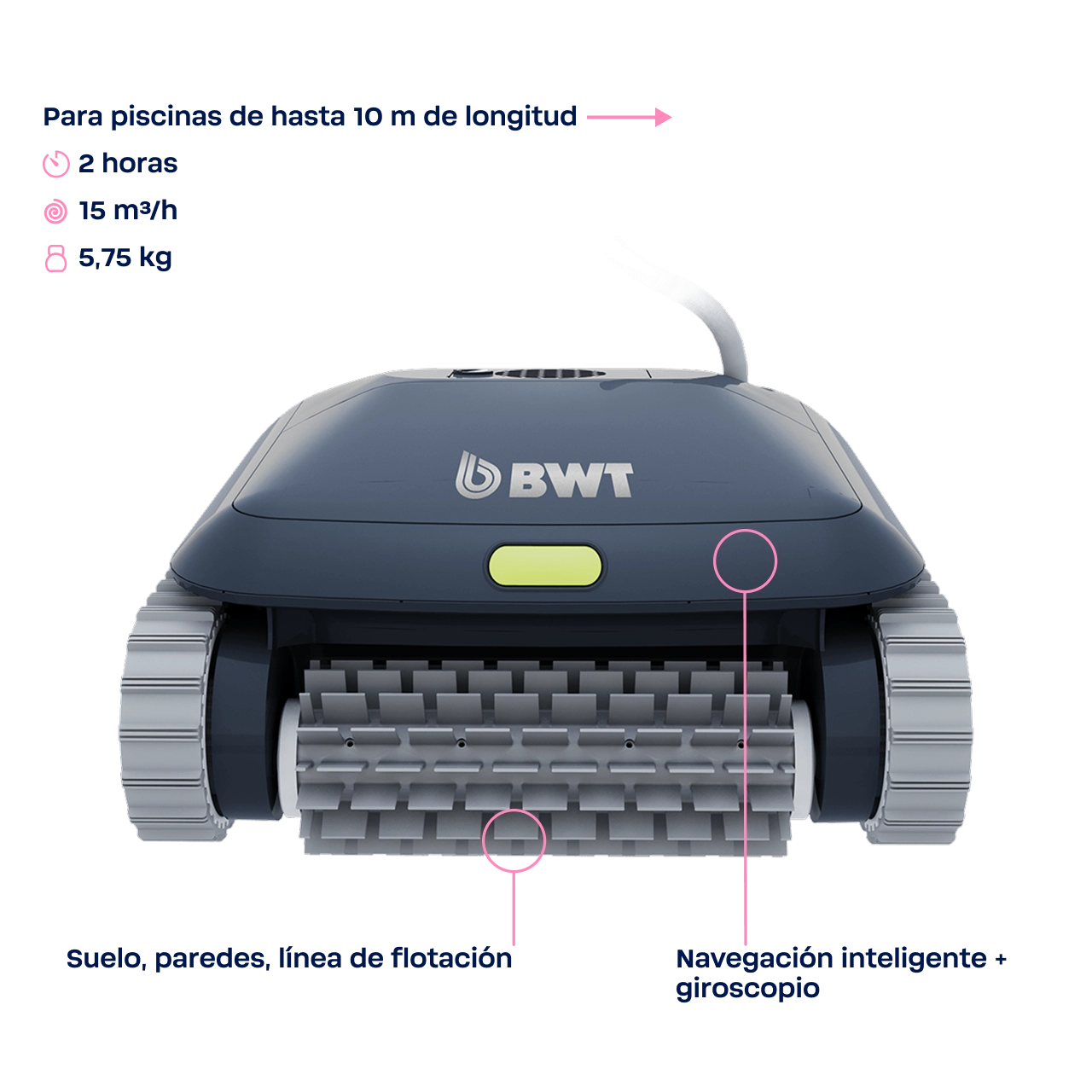 - POTENTE Y EFICIENTE: A pesar de su peso ligero de solo 5,75 kg, limpia el fondo, las paredes y la línea de agua con una potencia de succión de 15 m³/h. El ciclo de limpieza dura 2 horas, con cepillos de PVC y un filtro de 100 μ con una capacidad de 3,3 l.