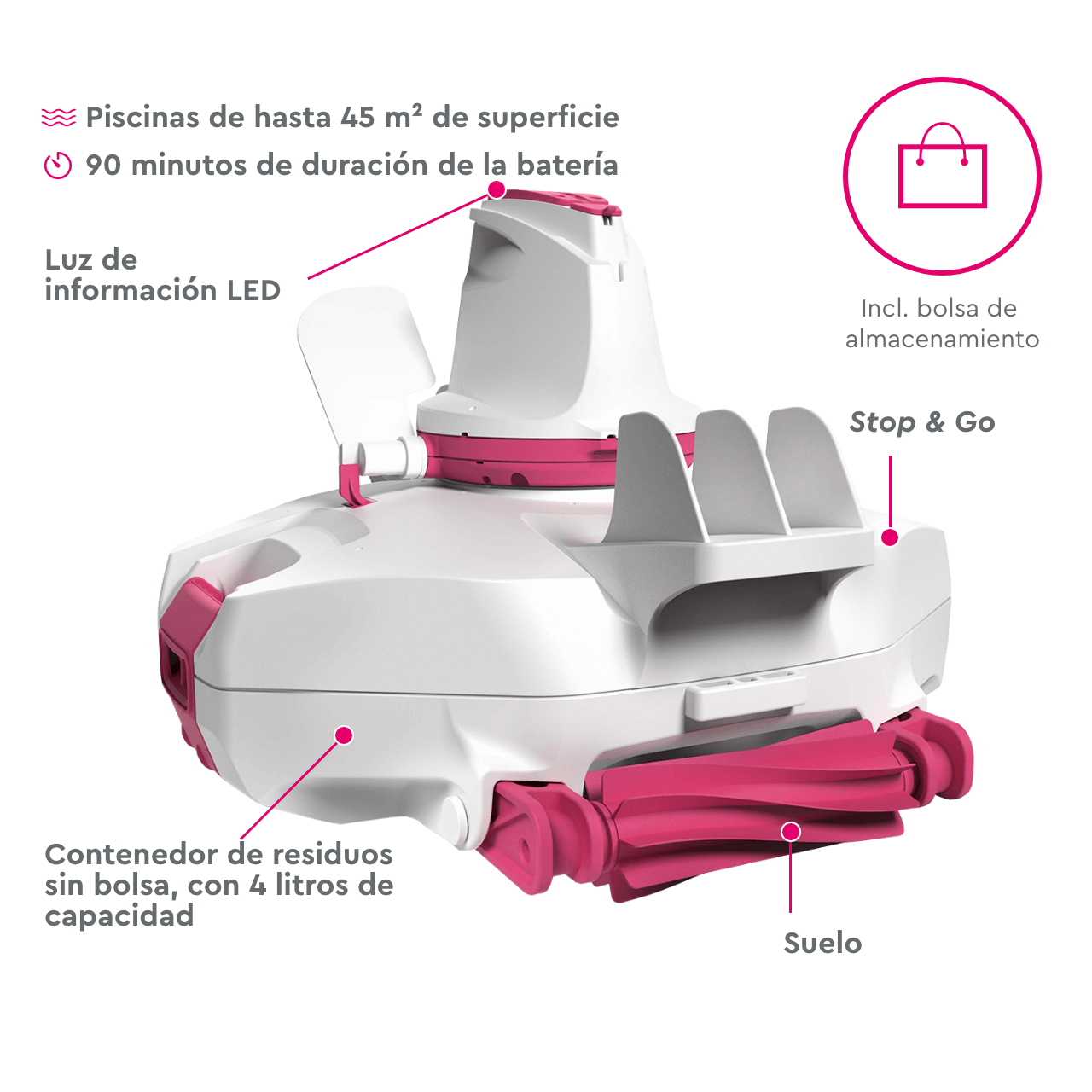 - USO INALÁMBRICO: No requiere conexión a la red eléctrica ni cable cerca de la piscina, batería recargable con una autonomía de hasta 90 minutos