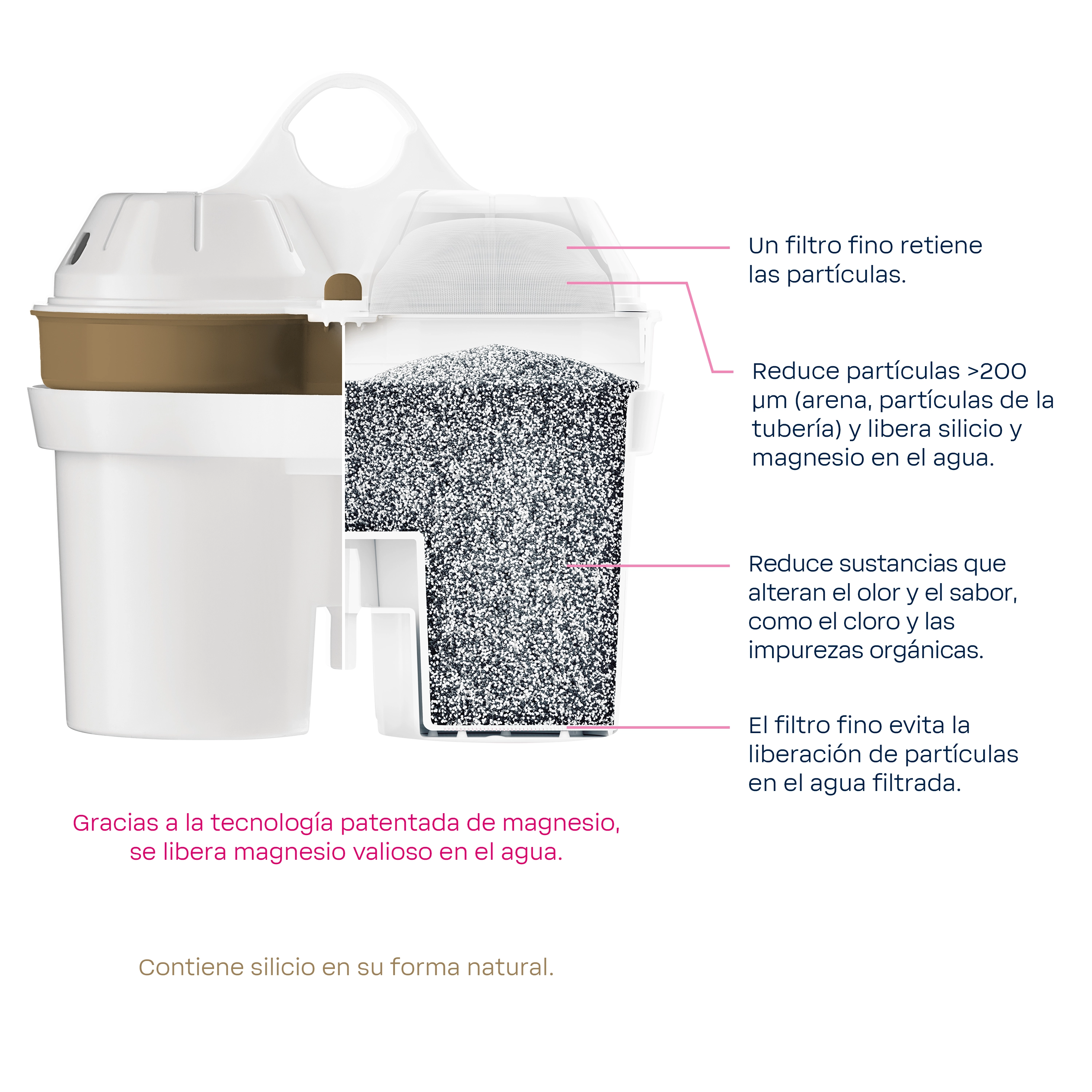 Nota del producto: En nuestro cartucho de Agua Mineralizada Silicato + Magnesio utilizamos silicatos y minerales naturales.Nos gustaría señalar que la abrasión de estos materiales puede ocurrir debido al transporte, que se libera en el agua al principio de la vida del filtro. Por ello, sobre todo los dos primeros litros pueden resultar turbios. Las sustancias turbias liberadas son completamente inofensivas. Por razones ópticas, le recomendamos que deseche los primeros 2-3 litros hasta que el agua sea clara.
