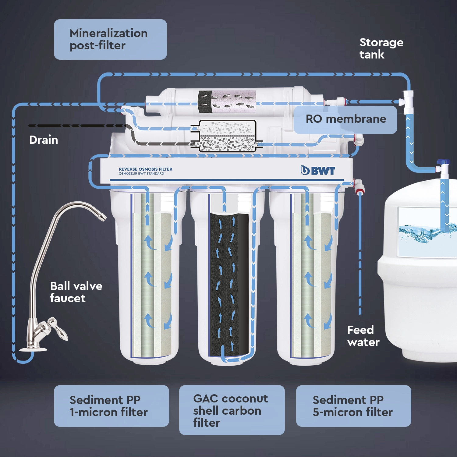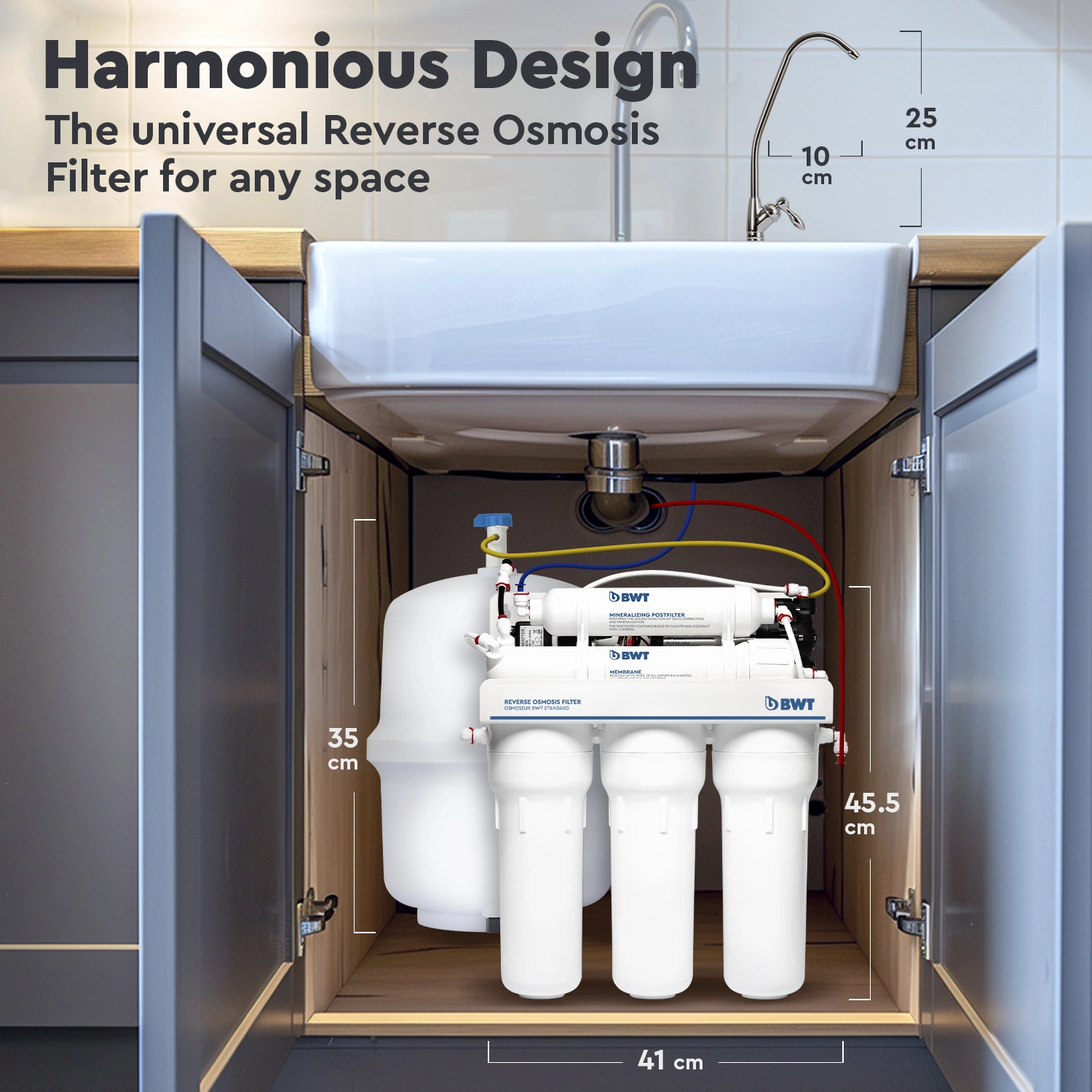 Gracias a la especial tecnología de filtración por membrana, el denominado sistema de filtro de osmosis inversa, se eliminan PFAS, metales pesados, microplásticos, bacterias, virus, hormonas, nitratos, cal y otros contaminantes del agua en un 99%.