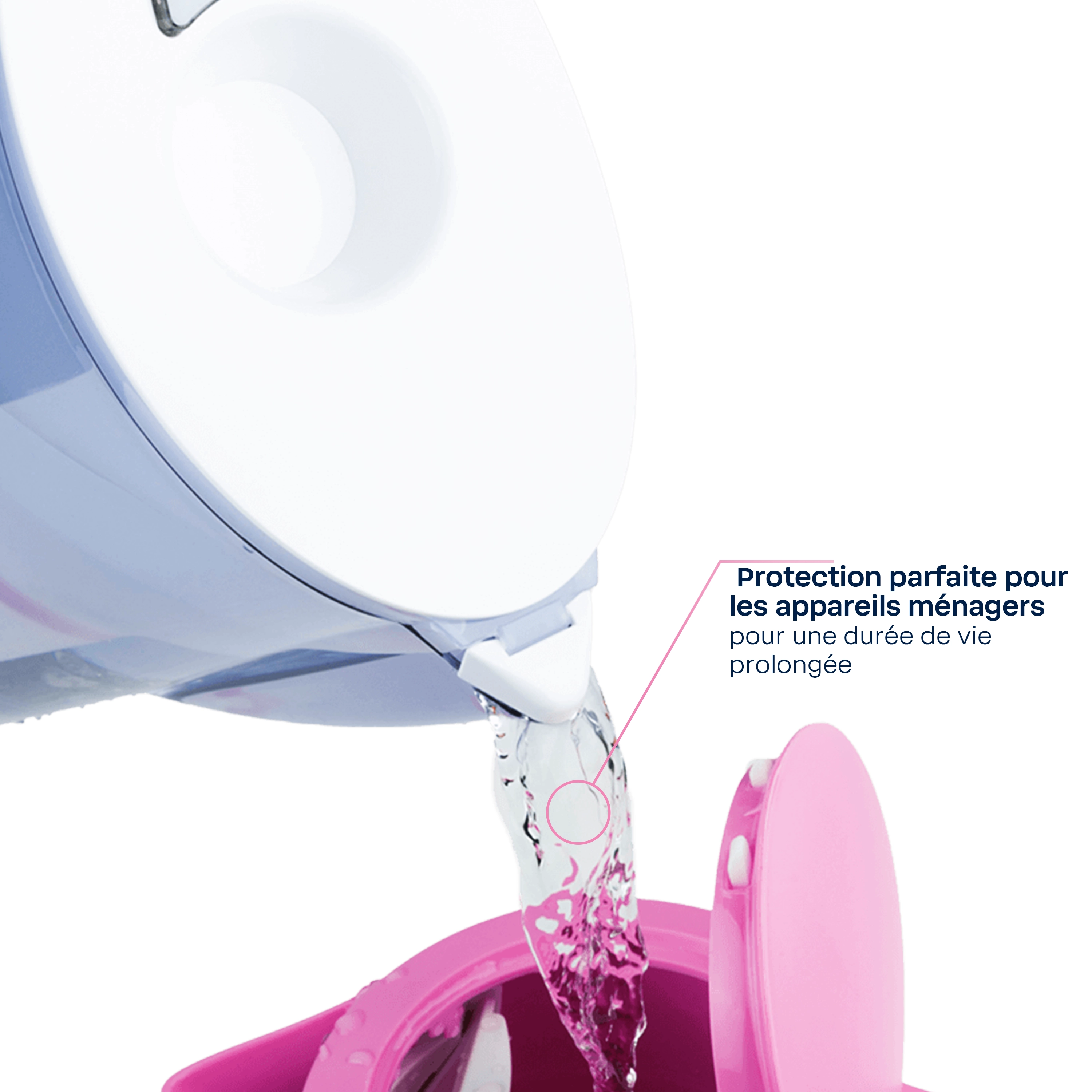 - Le clapet de remplissage s'ouvre automatiquement dès que le jet d'eau arrive, ce qui permet de remplir la carafe filtrante sans éclaboussures d'eau