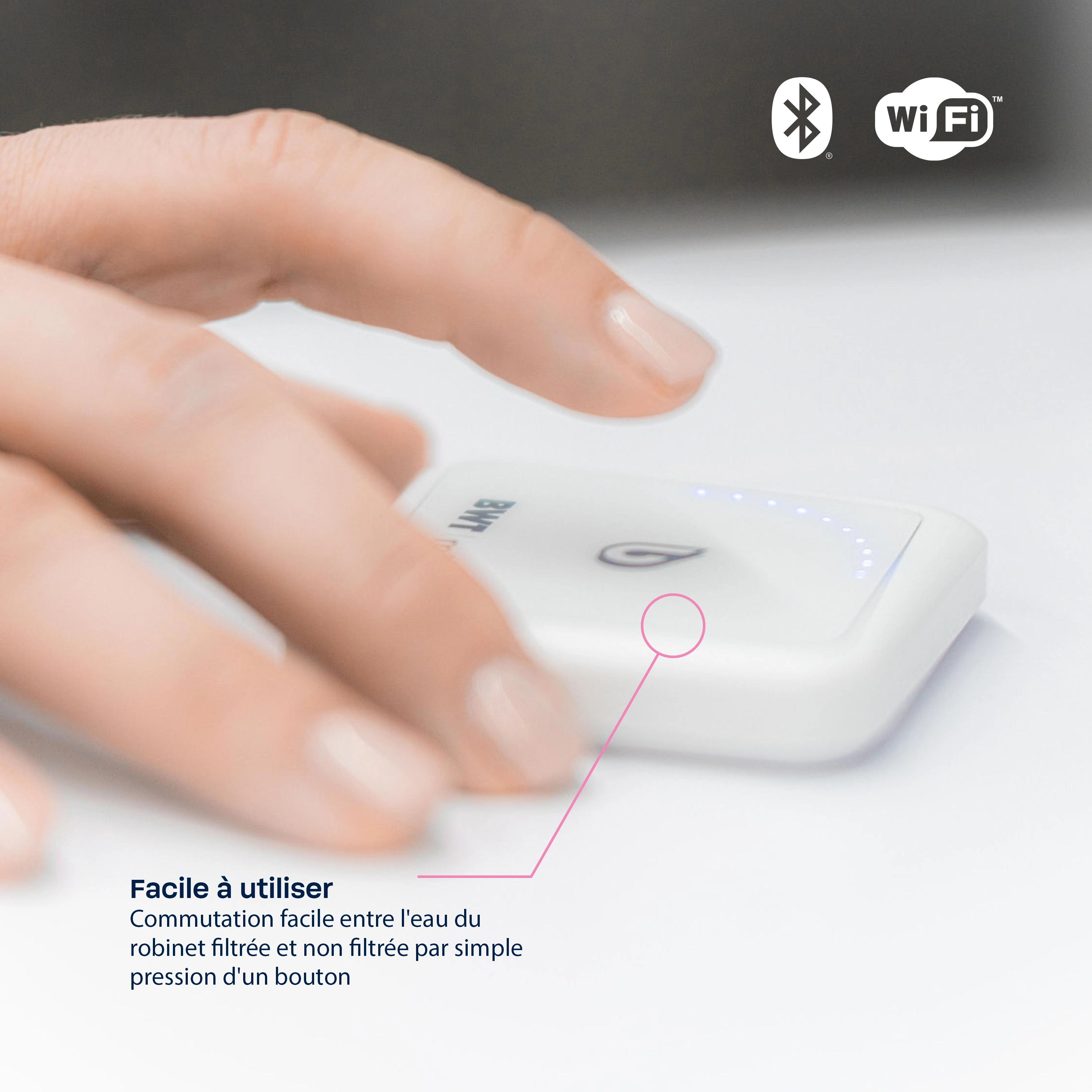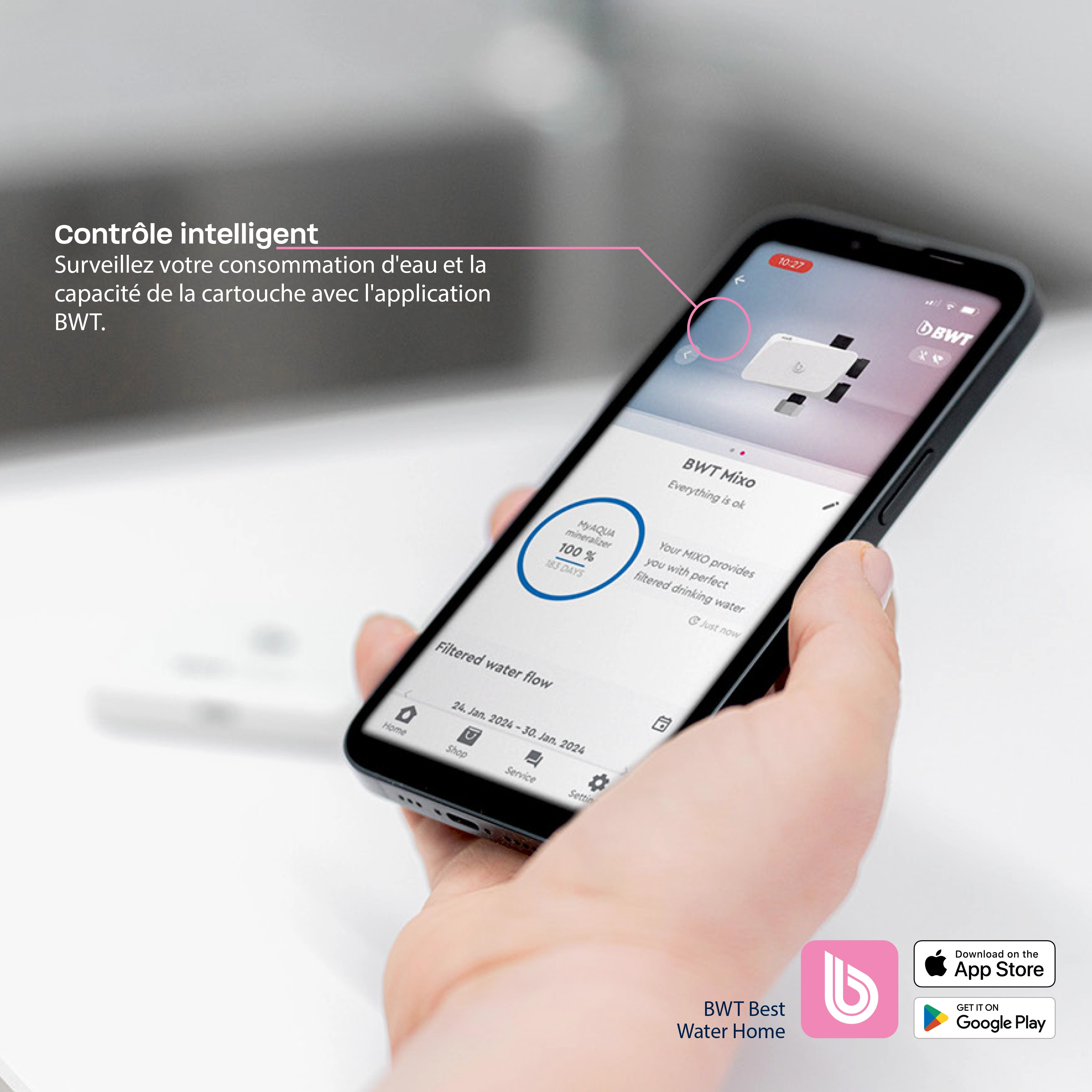 - Excellence technologique : BWT MIXXO est entièrement connecté – grâce au Bluetooth et au WiFi. Un capteur de débit intégré mesure la consommation d'eau et affiche le mode (Standard/Filtration) ainsi que l'état de la cartouche filtrante par des signaux optiques. Tout est sous contrôle avec l'application BWT Home !