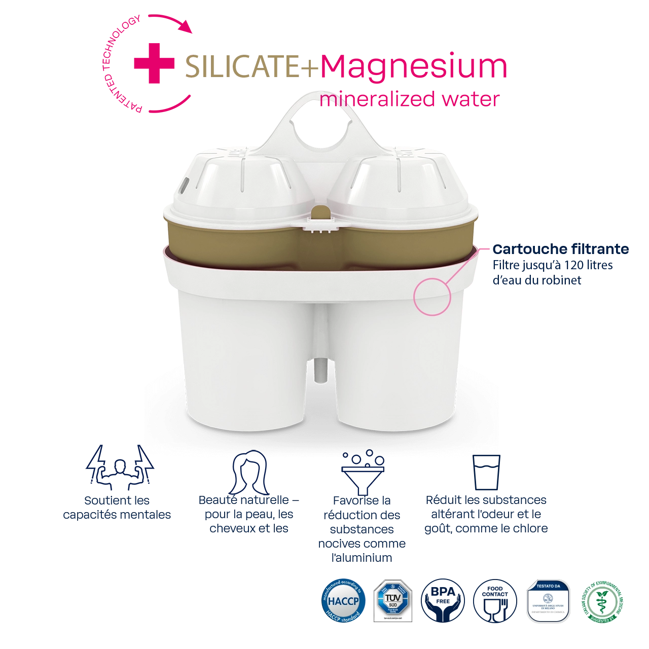 En général, le silicium est considéré comme un élément de beauté, car il soutient des fonctions essentielles pour la peau, les cheveux et les ongles. Il assure une fonction de transport importante dans le corps en favorisant le stockage de minéraux précieux. L'eau enrichie en silicium soutient la beauté naturelle et la fraîcheur mentale jusqu'à un âge avancé.