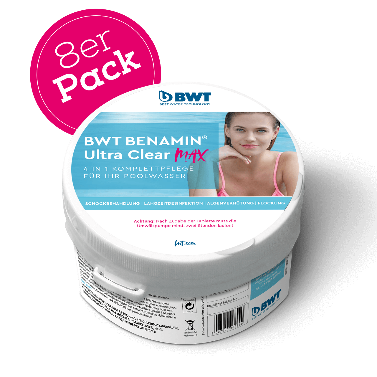Ce produit d'entretien pour piscine innovant est idéal pour tous les propriétaires de piscine qui souhaitent profiter des d'heures dans l’eau sans souci. Avant de placer la boîte auto-dosante dans le skimmer, il suffit d'enlever le couvercle dévissable très pratique. Aucun contact avec la pastille n'est nécessaire ! Pour un bassin de 40 m³, une boîte de BWT BENAMIN® Ultra Clear MAX de 600 g dure environ trois à quatre semaines. La super formule de BWT BENAMIN® Ultra Clear MAX 600 g garantit une eau de piscine cristalline avec une utilisation de chlore extrêmement réduite et nettement moins d'odeur de chlore.