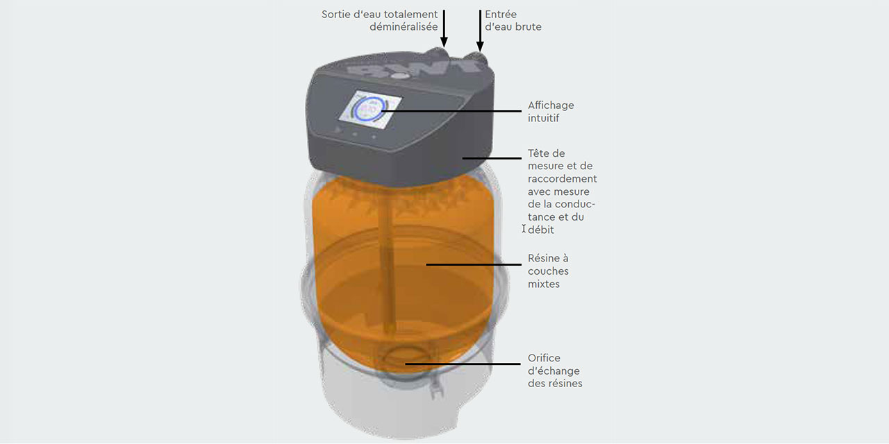 L’eau potable naturelle contient des minéraux sous forme dissoute, que nos cartouches de déminéralisation BWT éliminent. Ils contiennent des résines résistantes à l’eau qui ont la capacité d’échanger les ions accumulés contre les ions présents dans l’eau. Une qualité d’eau pure optimale, une disponibilité immédiate et une durabilité remarquable sont les atouts de la technologie moderne du traitement de l’eau.