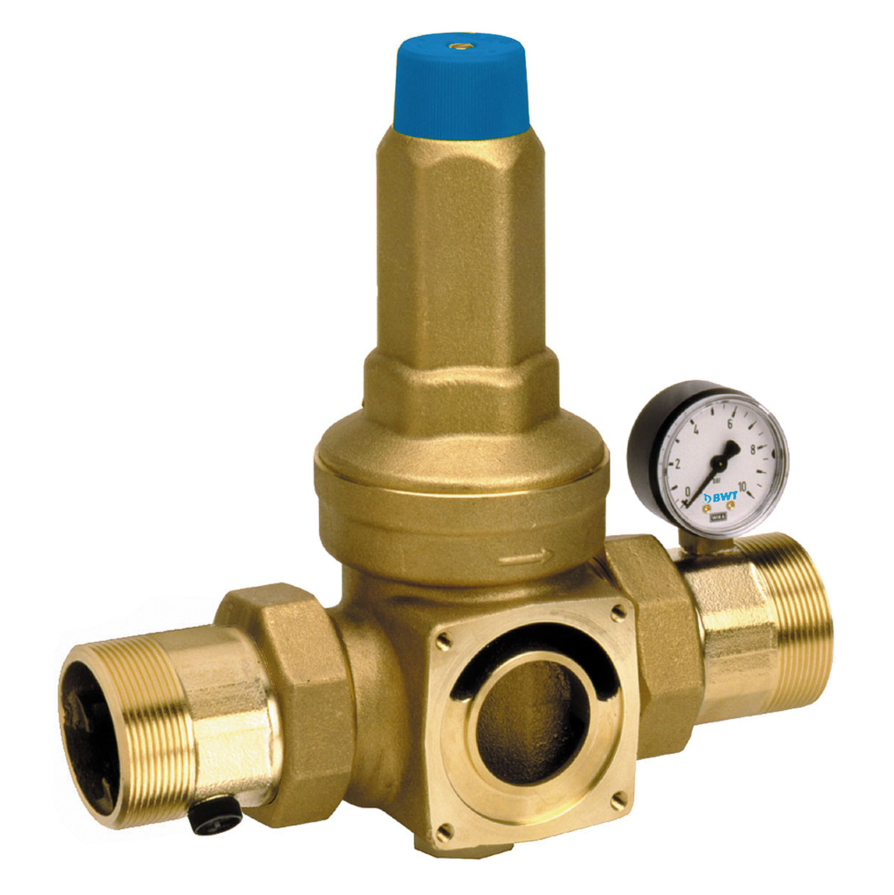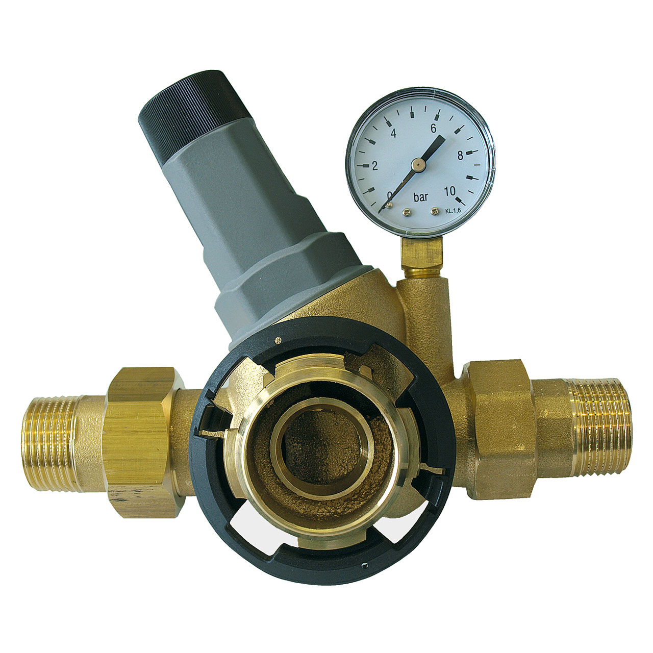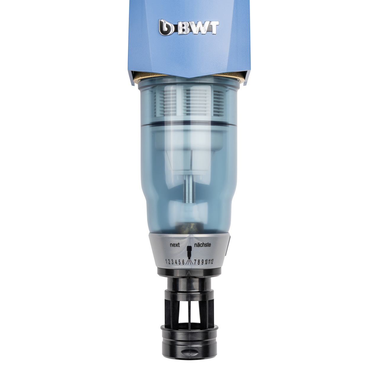 Construction : Tête en laiton avec arrivée d'eau brute, écoulement d'eau pure et réducteur de pression, pièce de jonction pivotante en laiton permettant un montage vertical ou horizontal, élément filtrant en tissu synthétique monofilaire résistant à la traction et à l'abrasion (90 µm), élément de rinçage à contre-courant avec anneaux d'aspiration, cylindre en matière plastique antichoc (PN16, pression d'éclatement > 90 bar), capuchon pour fermer la sortie d'eau de rinçage, raccordement à l'égout intégré, bouton tournant pour régler la pression, manomètre.