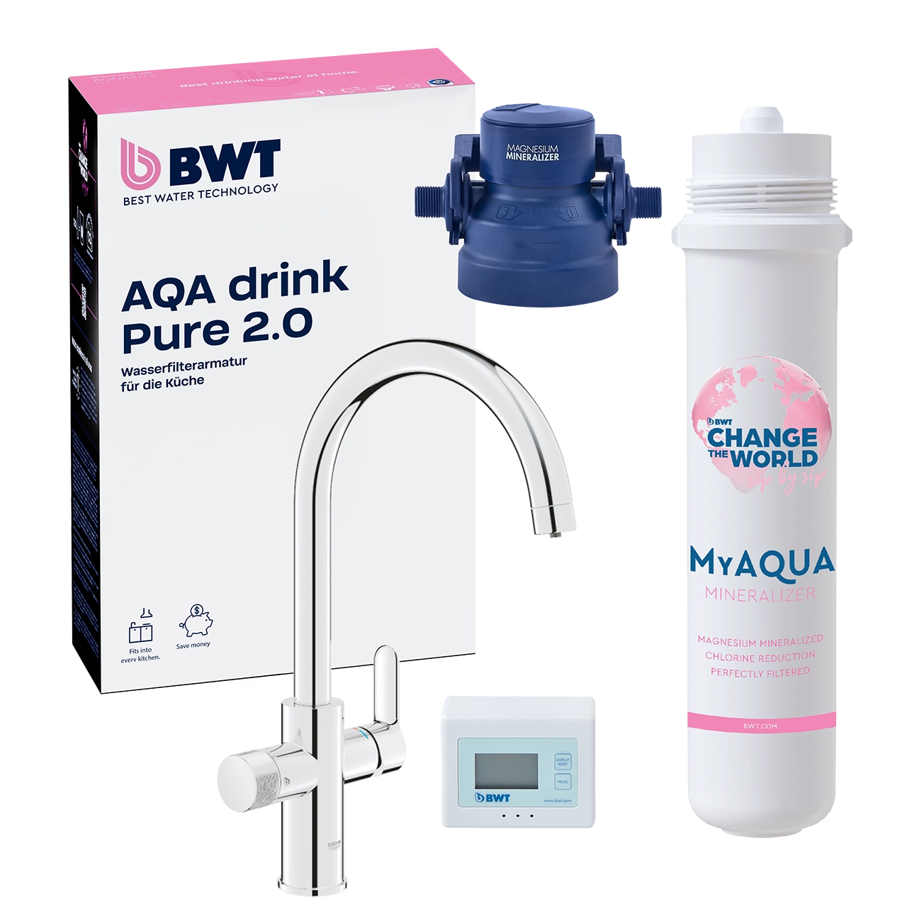 Le programme complet de filtres AQA drink peut être utilisé avec le nouveau robinet filtre BWT alimenté par Grohe. Améliorez votre eau potable en y ajoutant du magnésium et du zinc ! En cinq étapes de filtration, les odeurs et les saveurs désagréables telles que le chlore, ainsi que les métaux lourds tels que le cuivre, le plomb et le nickel, sont réduits. De plus, le filtre élimine efficacement le calcaire, protégeant ainsi vos appareils électroménagers.