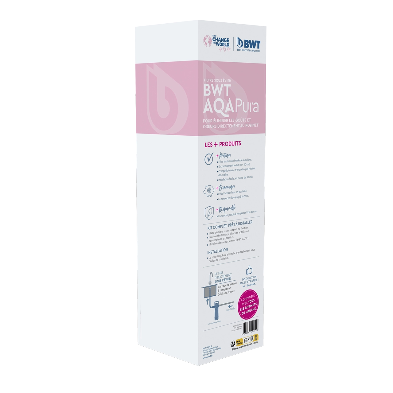 Le filtre AQA Pura s’installe très simplement sur la conduite d’eau froide, sous l’évier, grâce à une astucieuse tête de filtre orientable et un raccordement par flexible. Le système prend peu de place. Il est immédiatement opérationnel et vous délivre une eau agréable à consommer, à volonté. La capacité de la cartouche est d’environ un an (soit 10 000L) et se remplace facilement, sans outillage, en un coup de main.