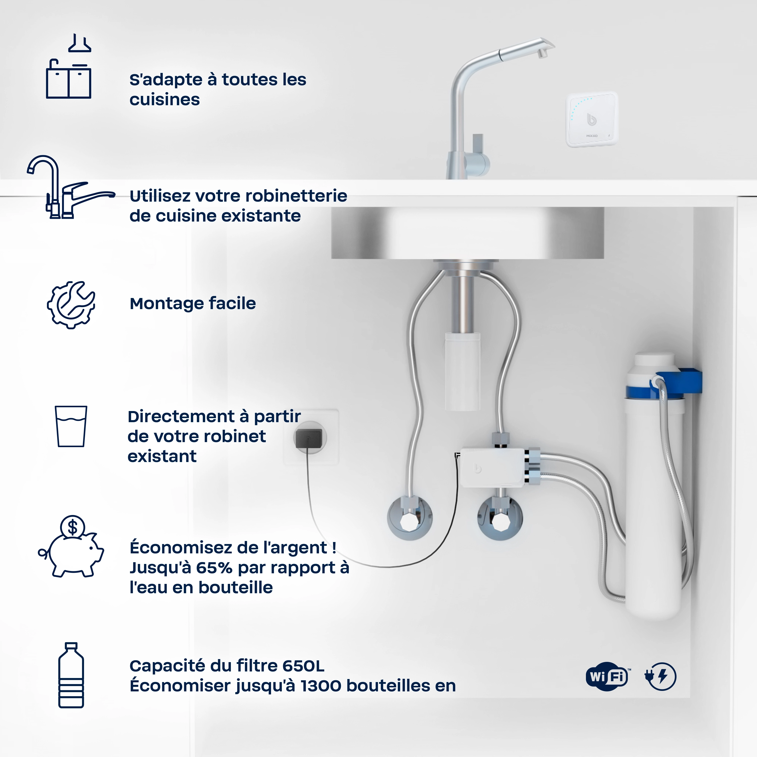 Avec BWT MIXXO, la solution innovante pour obtenir une eau délicieuse directement à partir de votre robinet, le plaisir de l'eau passe à la vitesse supérieure ! Avec BWT MIXXO, vous transformez votre eau du robinet en une eau parfaitement filtrée et minéralisée. Vous pouvez facilement installer le filtre sur votre robinet de cuisine existant sans avoir à le remplacer.