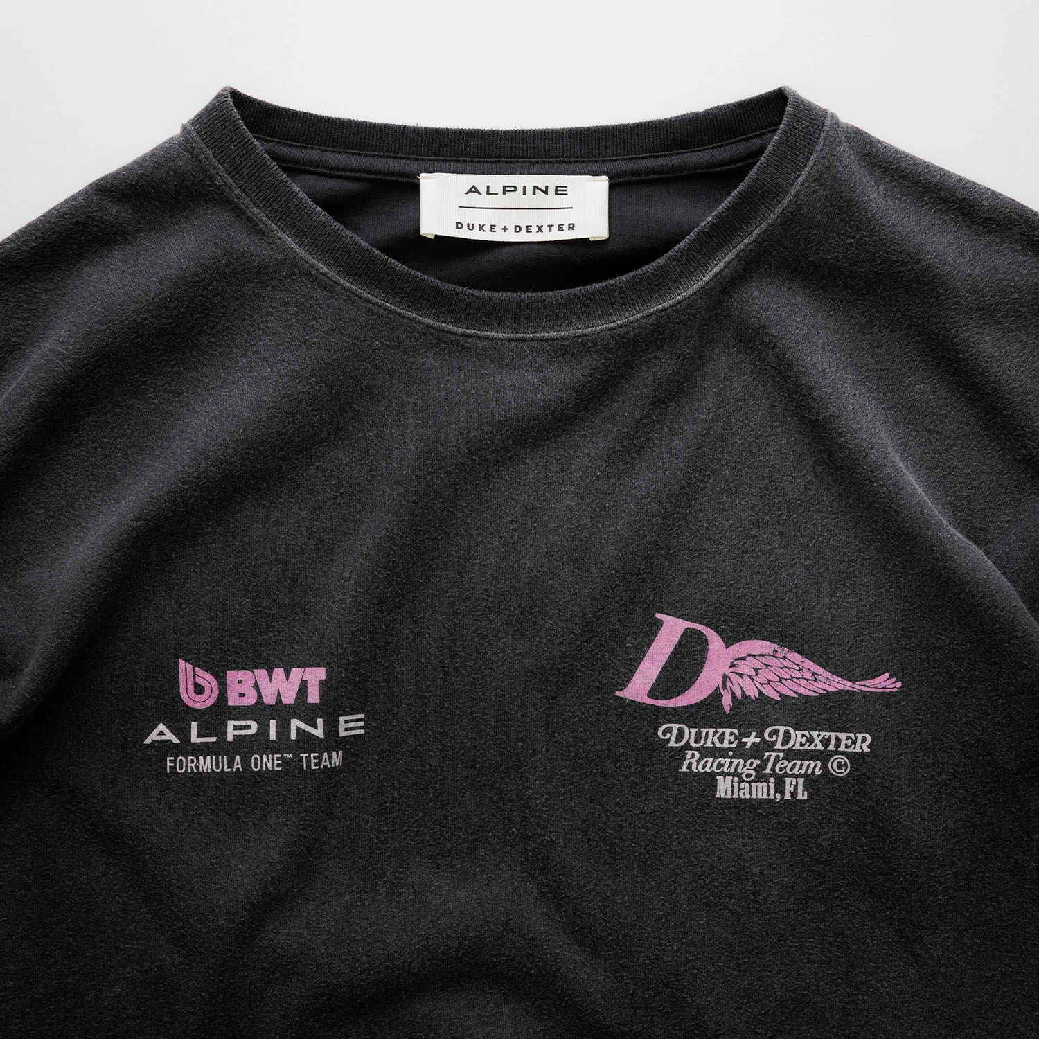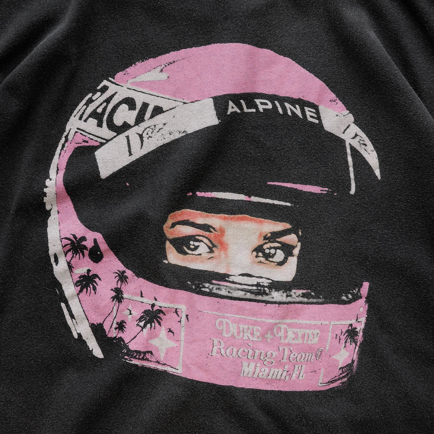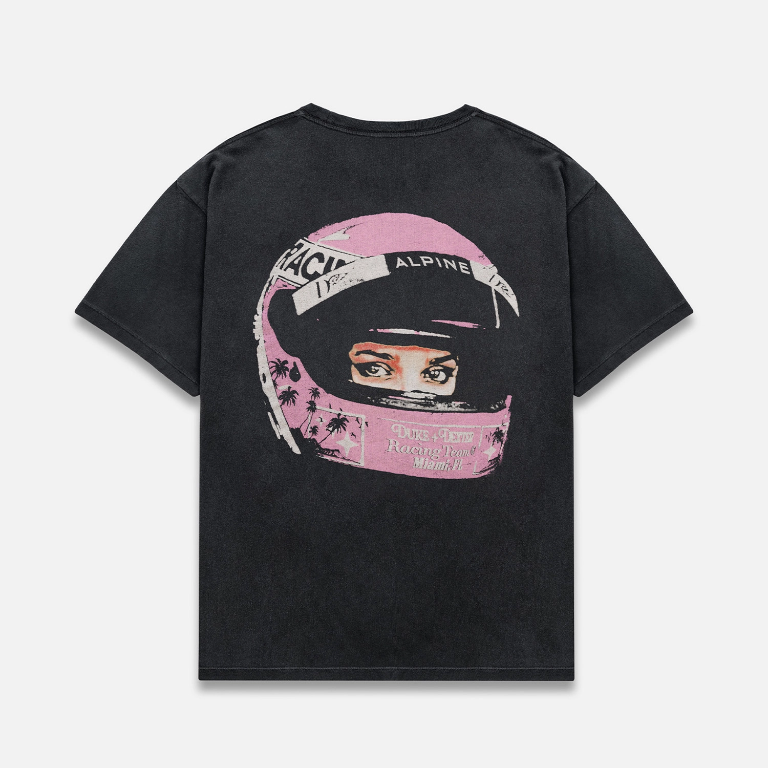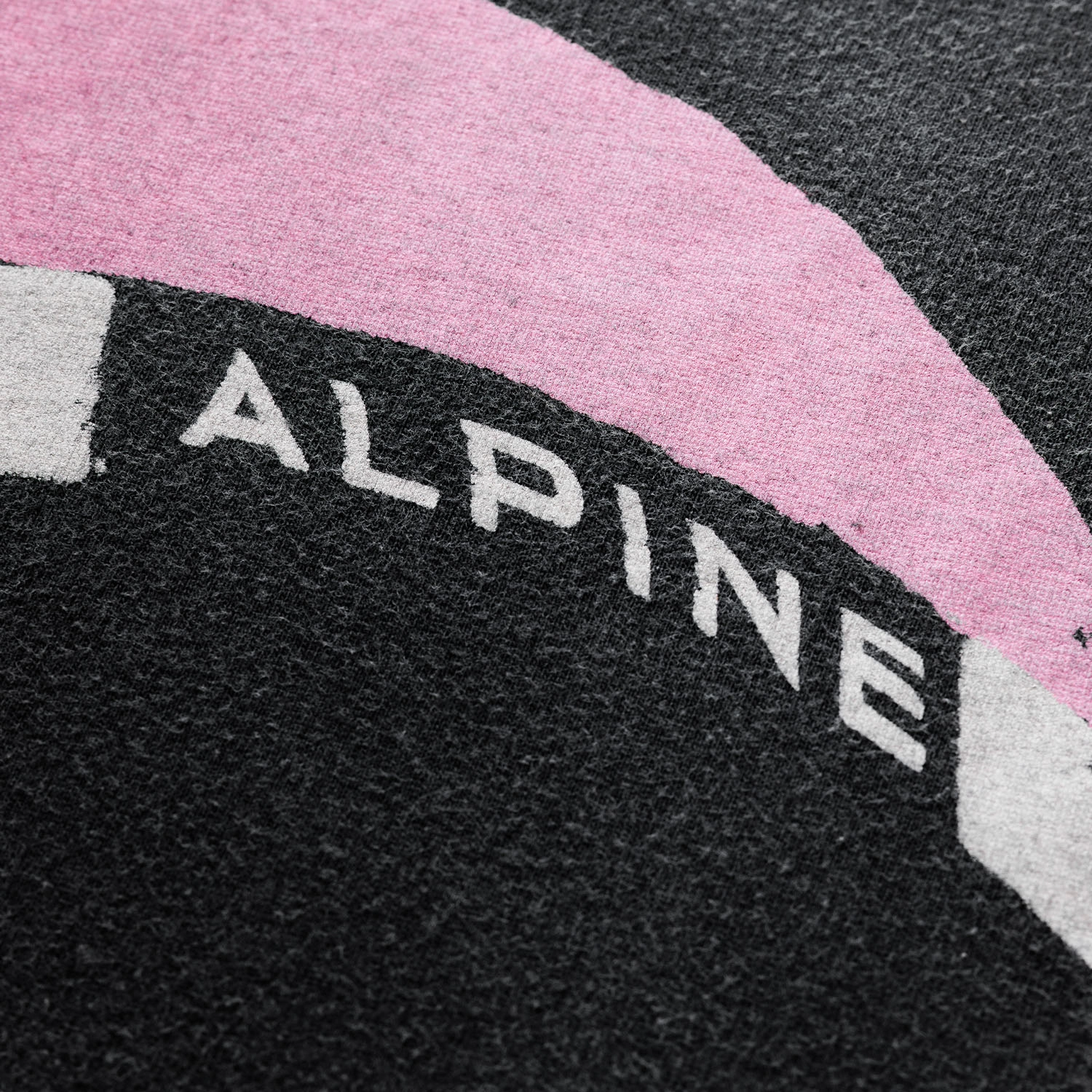 Für unsere Zusammenarbeit mit Alpine F1 haben wir unser meistverkauftes Helm-Design in Pink aktualisiert, um es an die Lackierung des Teams anzupassen. Auf der Rückseite dieses gewaschenen schwarzen T-Shirts gedruckt, besteht es aus maßgefertigtem, 220GSM Baumwoll-Jersey und ist mit wasserbasierten Farben im Siebdruckverfahren bedruckt. Schließlich wird es von Hand besprüht und sonnengebleicht, um einen Vintage-Look und -Gefühl zu erzeugen.
