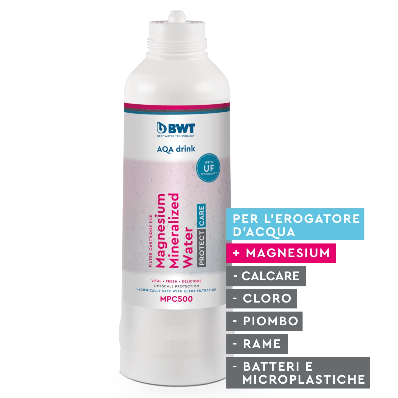 La cartuccia filtrante BWT AQA drink Magnesium Mineralized Water Protect Care riduce le sostanze che disturbano gli odori e il gusto come il cloro e i metalli pesanti come rame, piombo e nichel. Il filtro rimuove in modo affidabile il calcare, proteggendo così i tuoi apparecchi. La membrana di ultrafiltrazione integrata trattiene il 99,9999% di tutti i batteri e riduce le microplastiche per una maggiore sicurezza igienica. La tecnologia brevettata BWT al magnesio arricchisce l'acqua filtrata con il prezioso minerale magnesio. In questo modo si ottengono i migliori risultati sensoriali per le bevande calde e fredde. Il filtro può essere installato in combinazione con un distributore di acqua potabile AQA drink.
