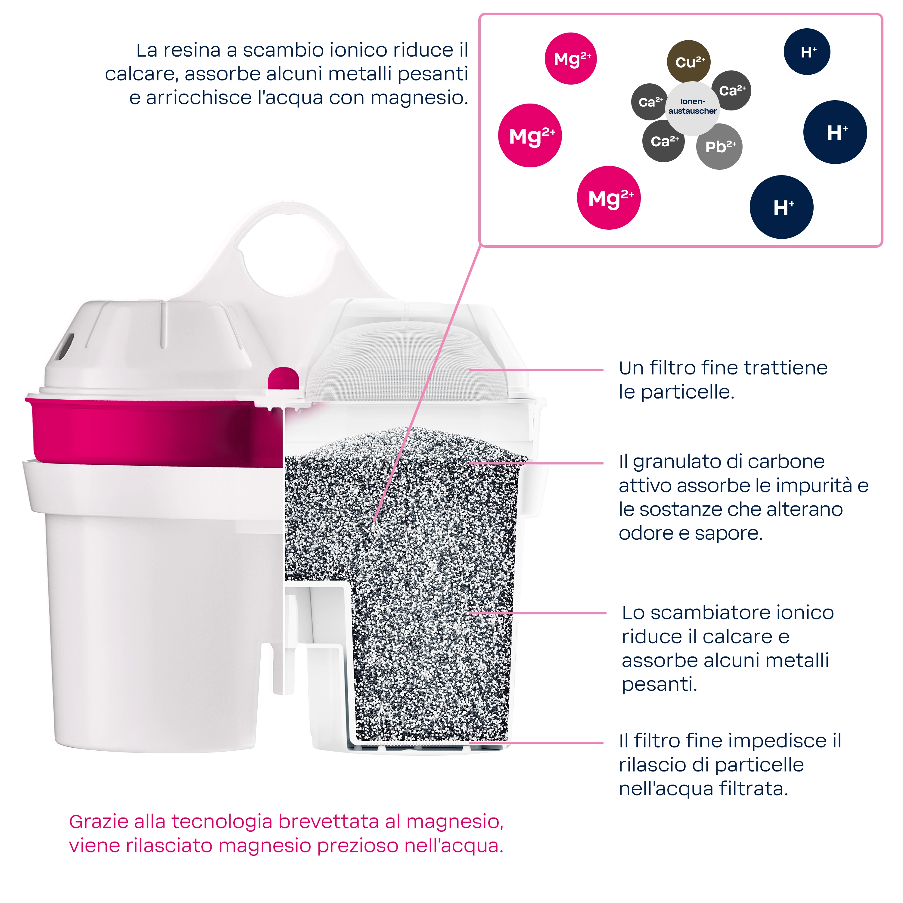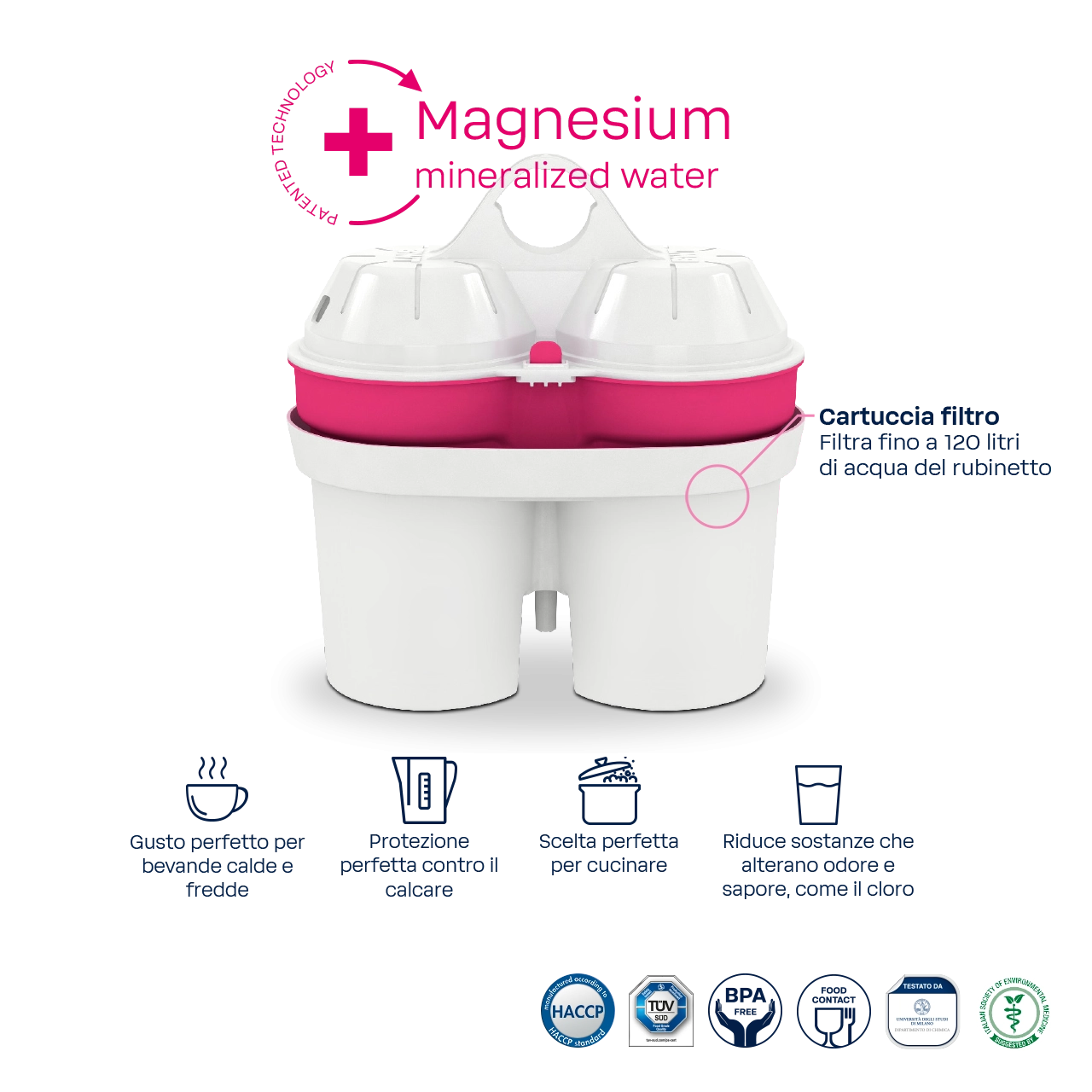- Trasforma l’acqua del rubinetto in acqua potabile dal gusto eccellente e ricca di magnesio