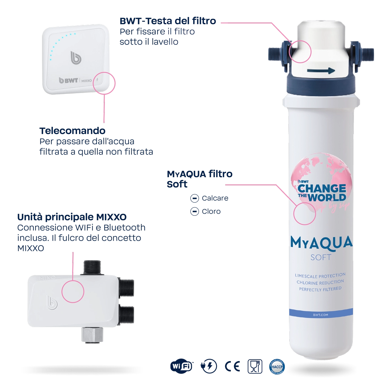 - Eccellenza tecnologica: BWT MIXXO è completamente connesso – grazie a Bluetooth e WiFi. Un sensore di flusso integrato misura il consumo di acqua e mostra la modalità (Standard/Filtrazione) e lo stato della cartuccia filtrante tramite segnali ottici. Tutto sotto controllo con l'app BWT Home!