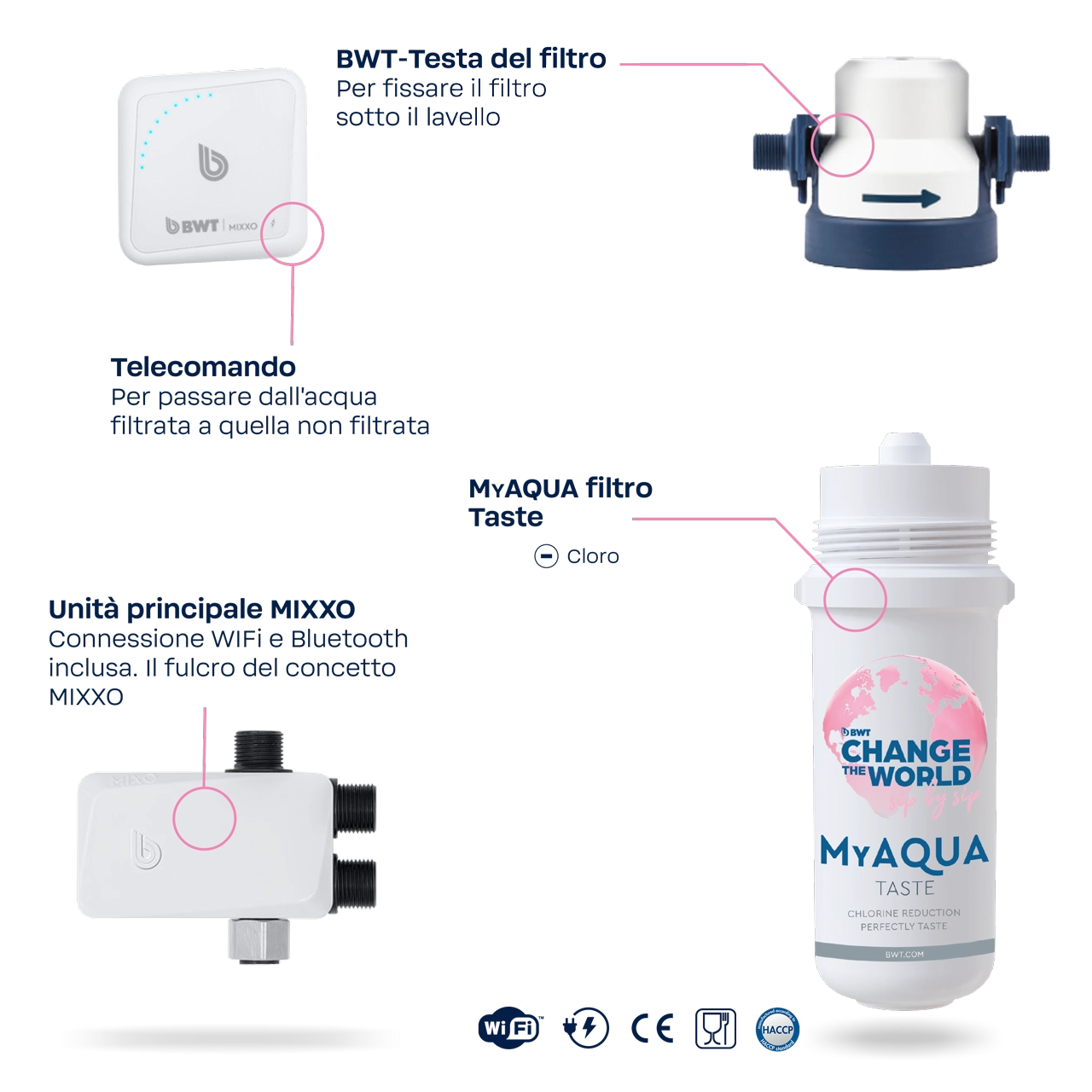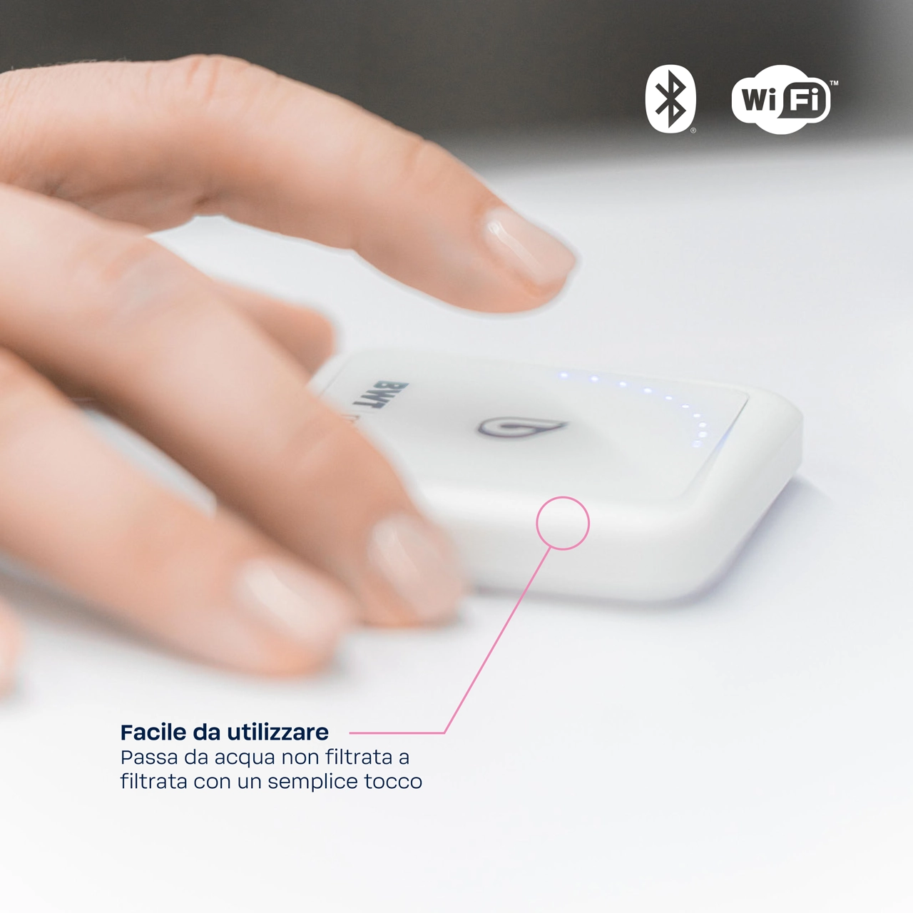- Eccellenza tecnologica: BWT MIXXO è completamente connesso – grazie a Bluetooth e WiFi. Un sensore di flusso integrato misura il consumo di acqua e mostra la modalità (Standard/Filtrazione) e lo stato della cartuccia filtrante tramite segnali ottici. Tutto sotto controllo con l'app BWT Home!