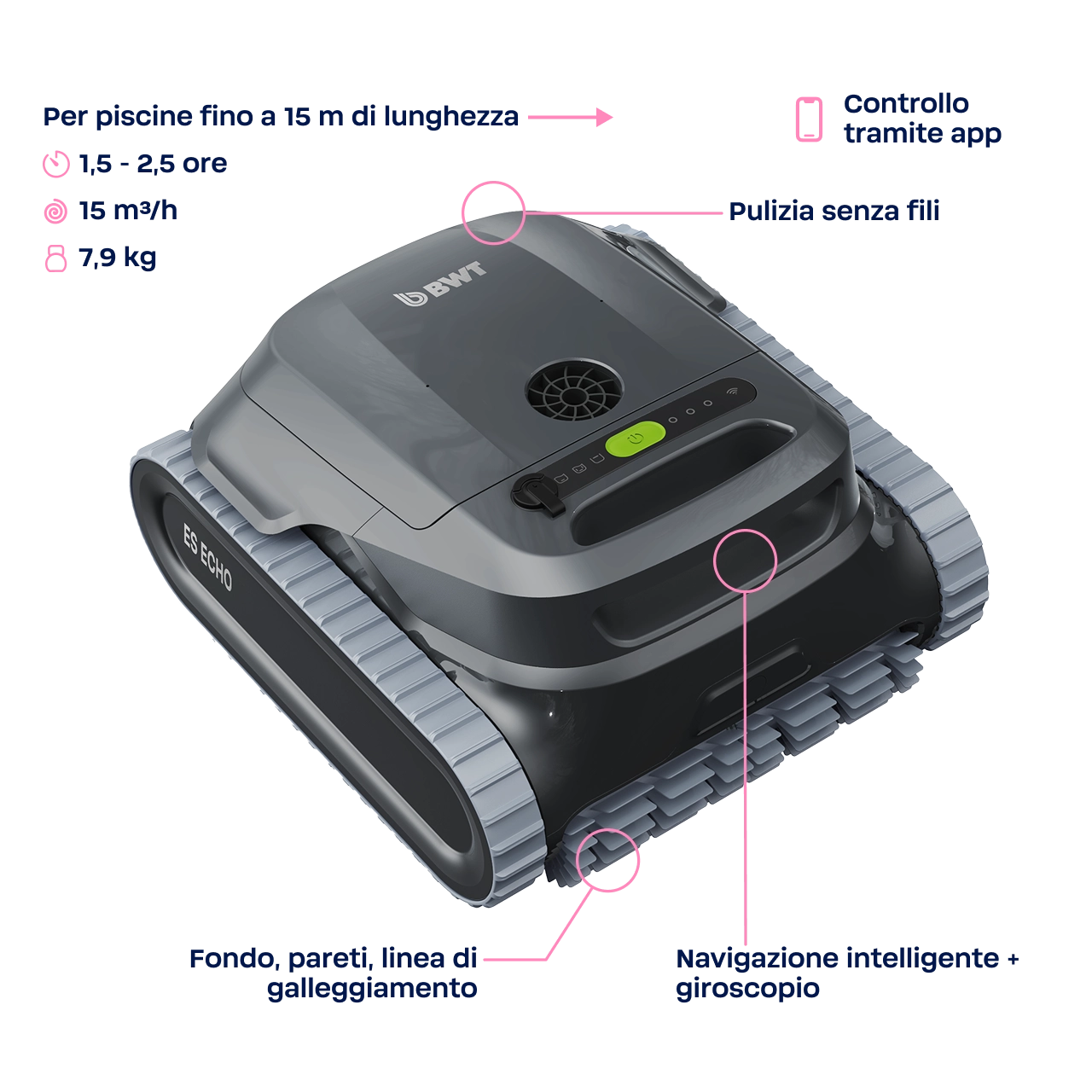 Con una garanzia di 2 anni, il robot per piscina BWT ES ECHO sottolinea la sua qualità costruttiva e affidabilità. Così, investi in una manutenzione professionale della piscina che garantisce acqua pulita e accogliente a lungo termine.
