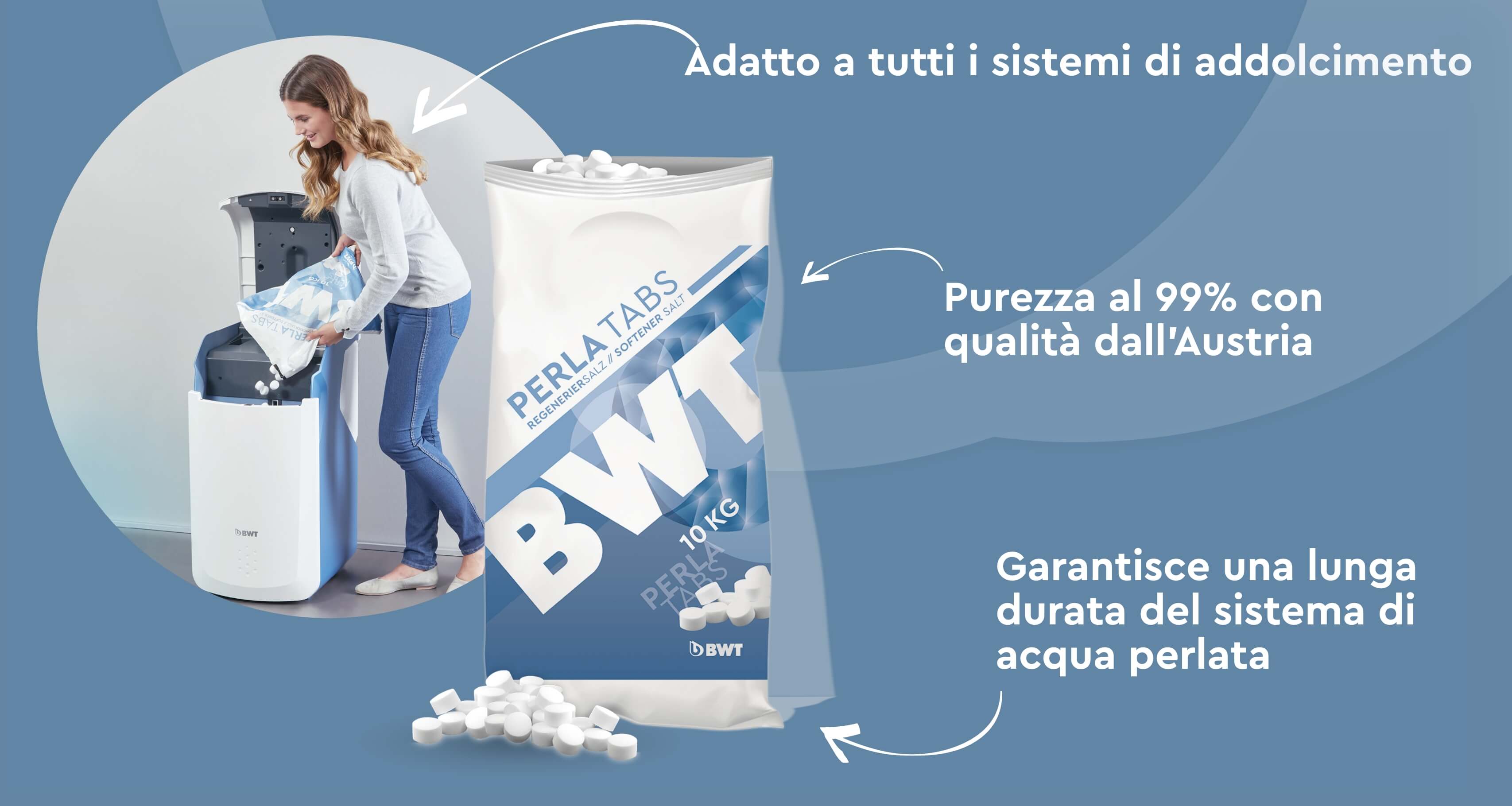 A seconda dell'apparecchio che hai installato a casa, BWT ti offre ovviamente anche i materiali di consumo . Le BWT Sanitabs, il sale in pastiglie o il sale rigenerante possono essere riordinati comodamente online.