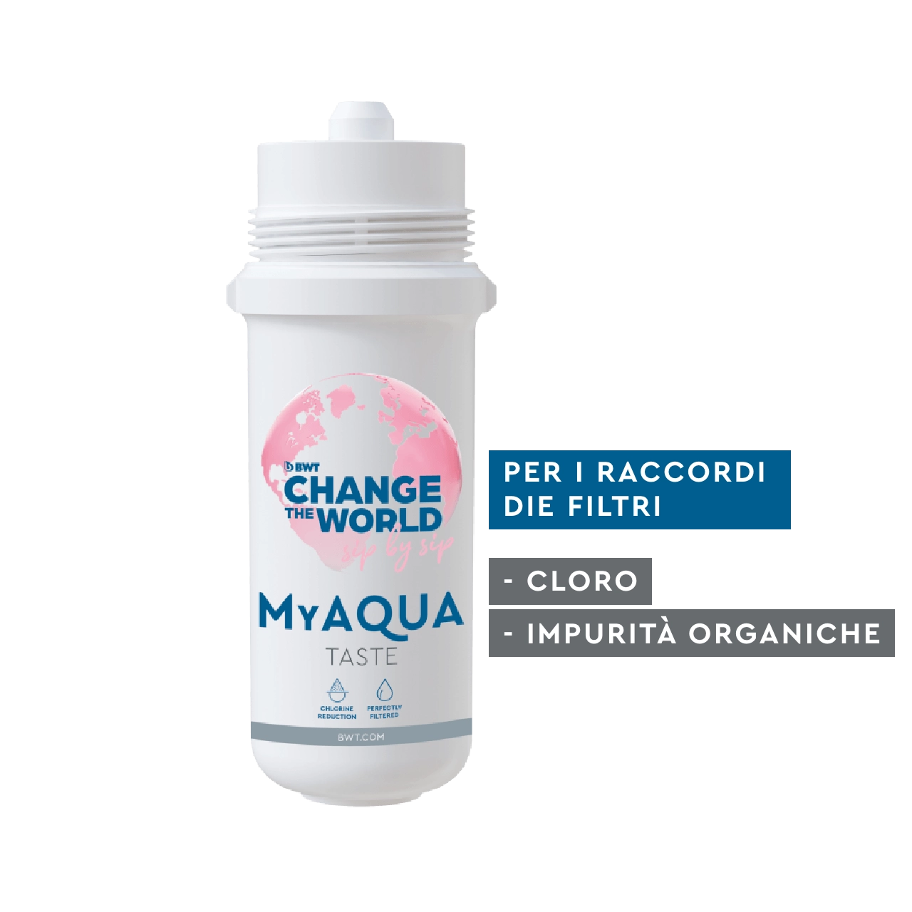 Prova il gusto puro con la cartuccia MyAQUA Taste e goditi bevande e cibi senza il fastidioso odore di cloro e particelle indesiderate.