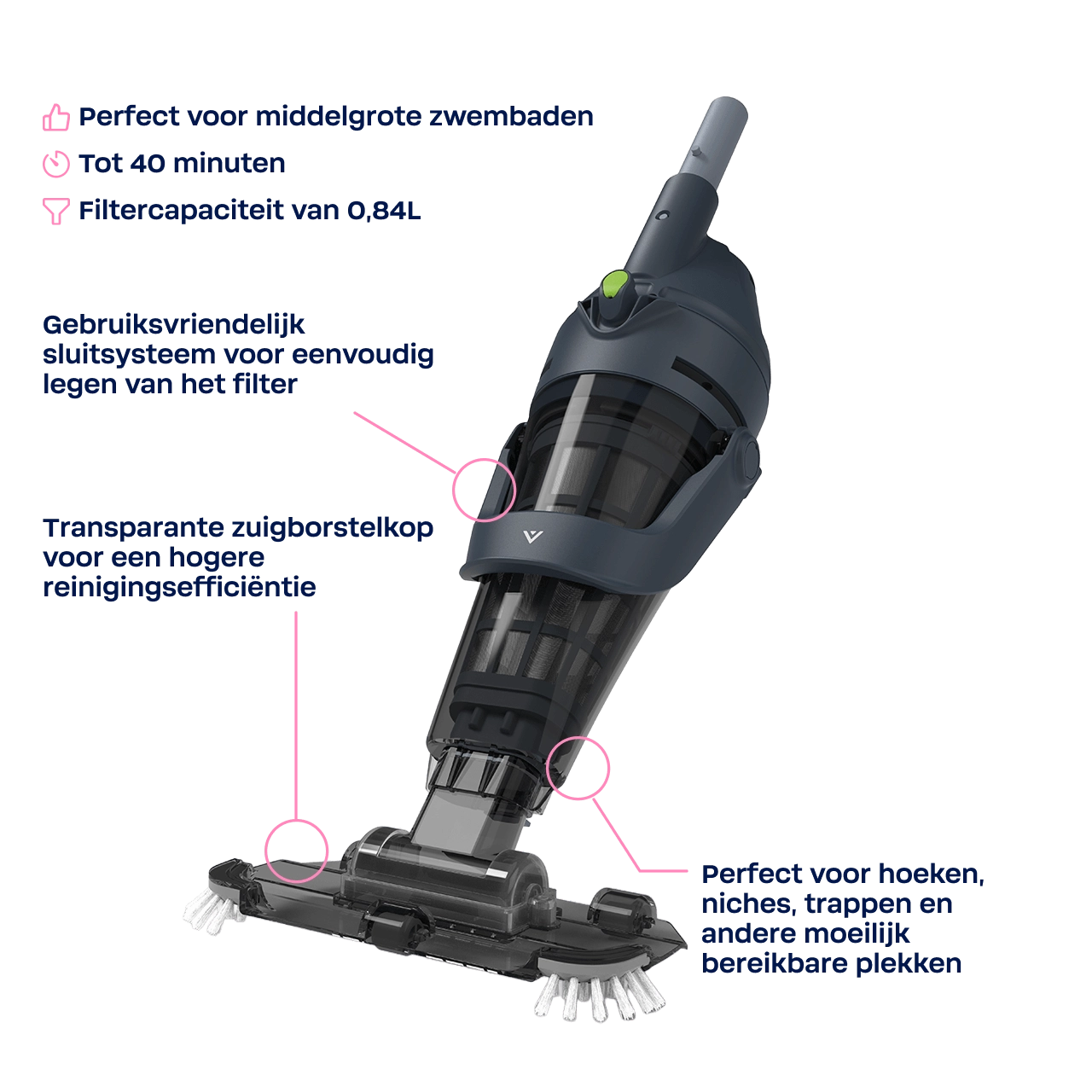 De BWT ES50 is het krachtigste model uit de Essential-serie en ideaal voor middelgrote tot grote zwembaden. De 11,1V motor en het nieuwe transparante ontwerp zorgen voor maximale zuigkracht en controle. Dankzij het grotere roestvrijstalen filterkegeloppervlak en de meegeleverde fijnfiltersok wordt zelfs het kleinste vuil opgevangen.