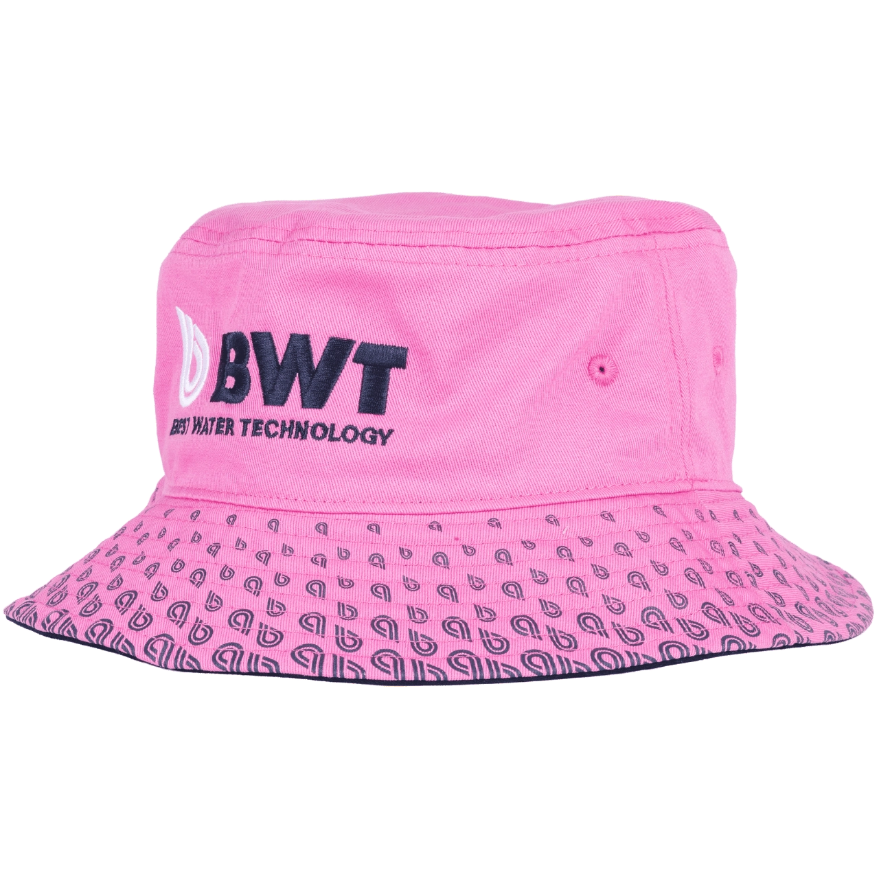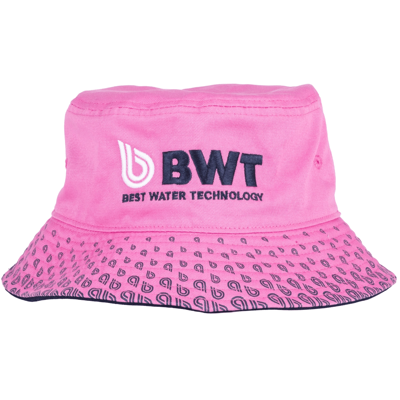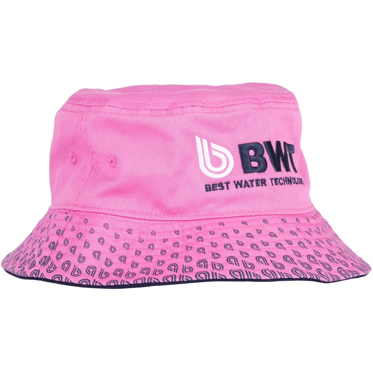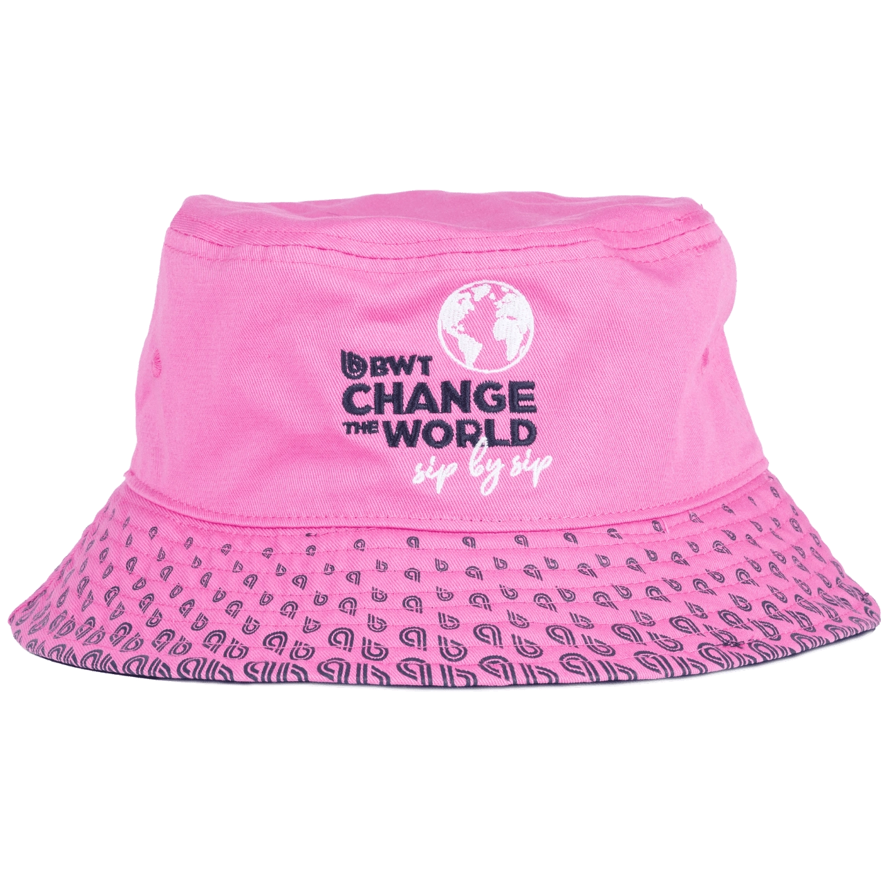 Stylish bucket hat in vibrant pink with a high‑quality front panel print “BWT – Best Water Technology” and the side slogan “Change the World”.
