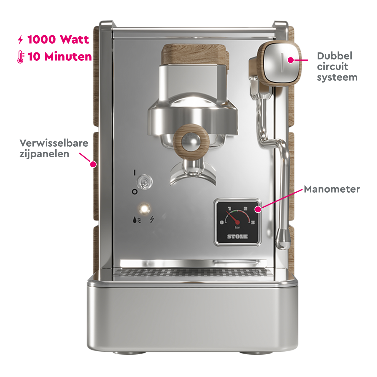 De Stone Mine espressomachine valt op door zijn compacte ontwerp gecombineerd met hoogwaardige afwerking. De machine is volledig van metaal, wat zorgt voor optimale temperatuurstabiliteit en een perfect resultaat in de kop.